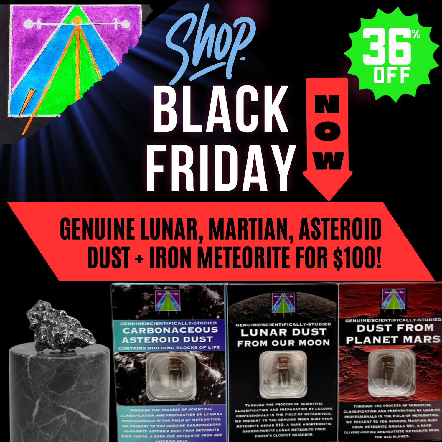 Black Friday is only once a year, and we want to celebrate by offering you this limited time holiday offer of all 3 of our popular dust vial sets (Lunar, Martian and Carbonaceous Asteroid) PLUS an iron meteorite that, upon impact, contributed to the creation of 26 HUGE craters - one being the size of a professional stadium football field!