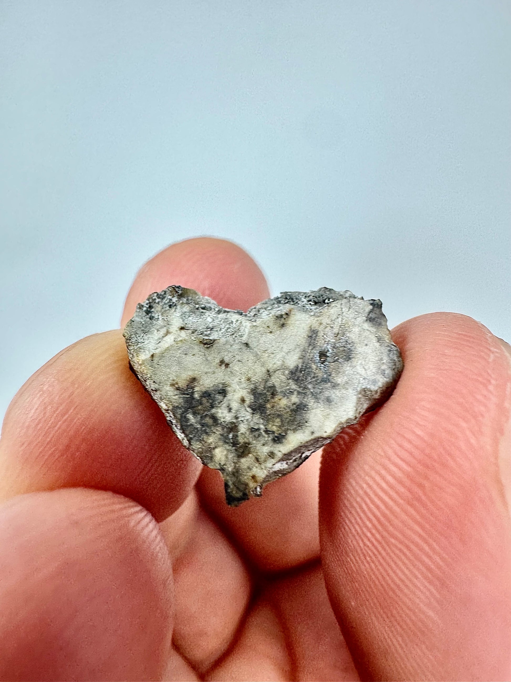 Classified as an aubrite meteorite, a subset of achondrites, this class makes up less than 0.2% of all known meteorites. It is primarily made up of the mineral enstatite. Its appearance is fairly light in color, with patches of black that are likely remnants of a weathered fusion crust. Inside, the stone shows a marbled mix of beige and gray hues, broken up by occasional dark or rusty spots and, less frequently, tiny metallic inclusions.
