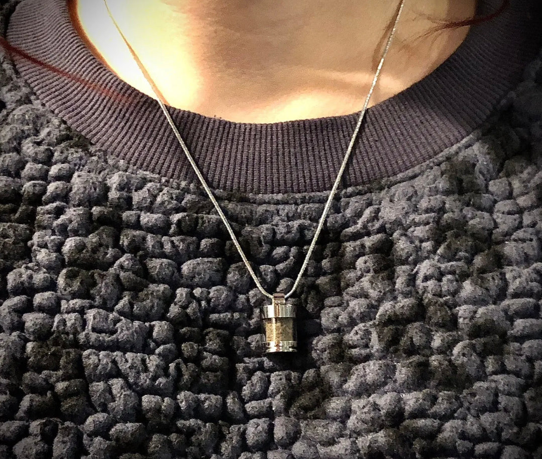 The vial is made with solid stainless steel encased with glass. Inside, genuine dust from Mars resides. The chain length is 18.9” (48cm). The stainless steel/glass vial measures .51” wide (13mm) by .87” tall (22mm)