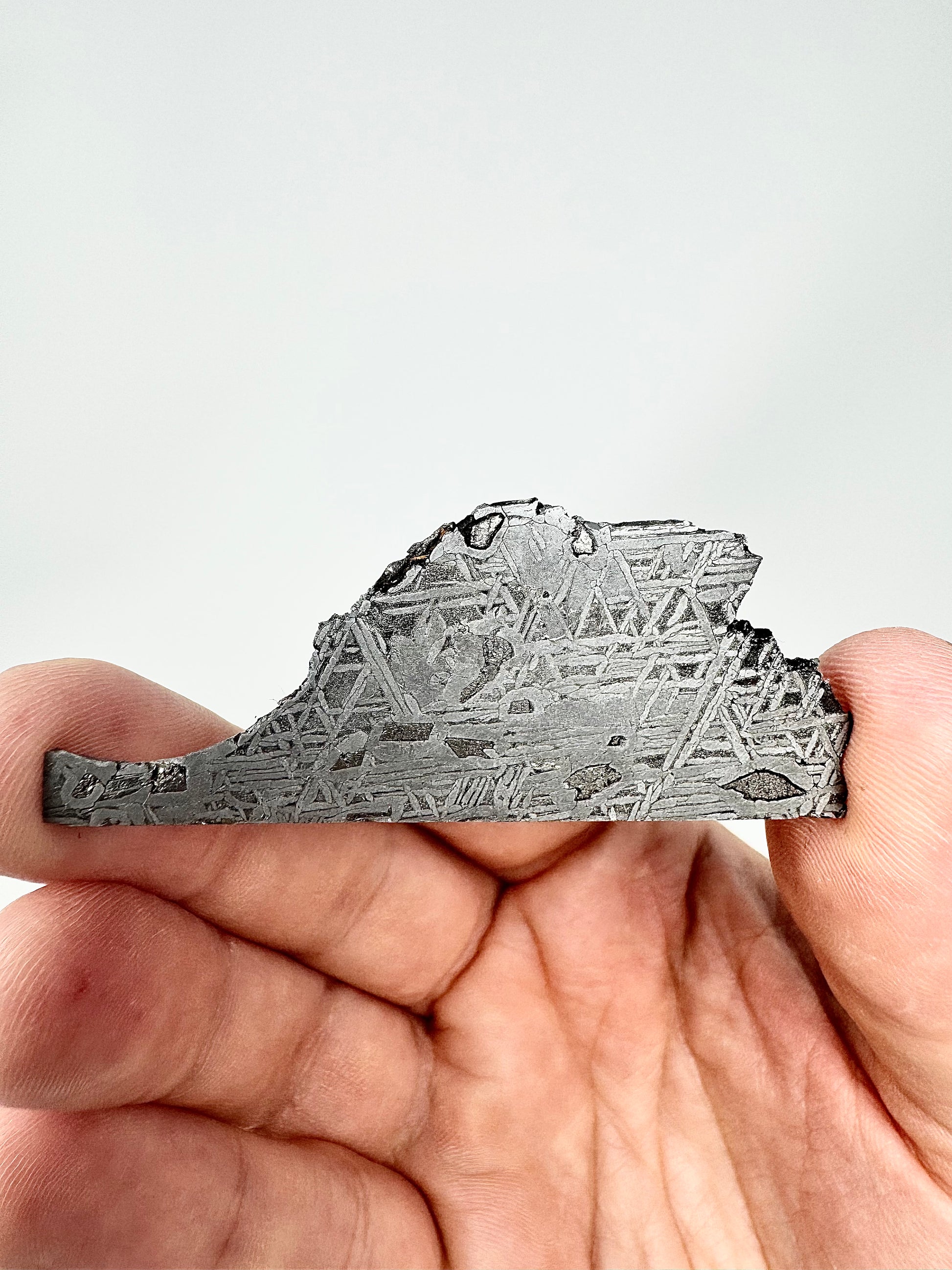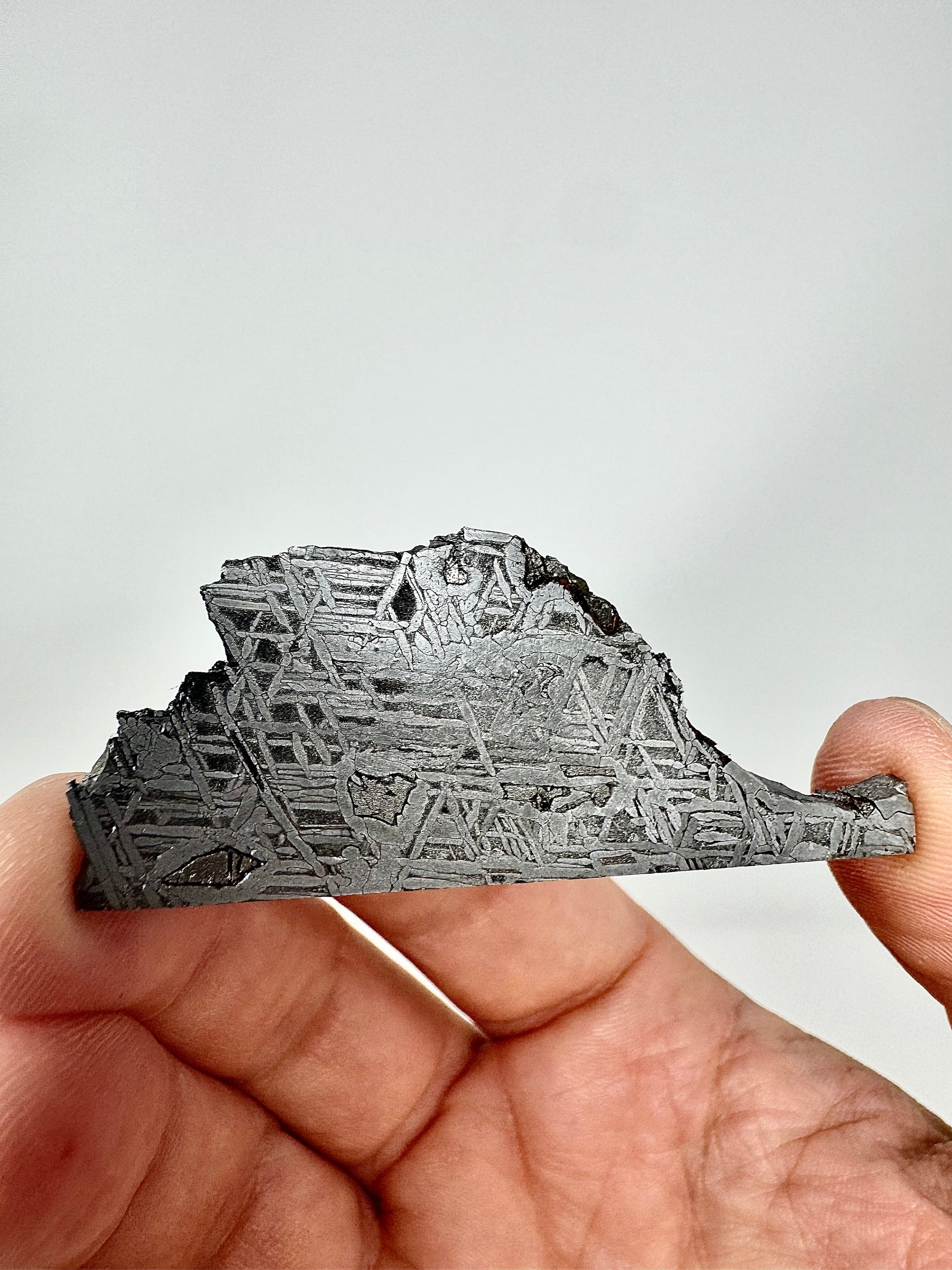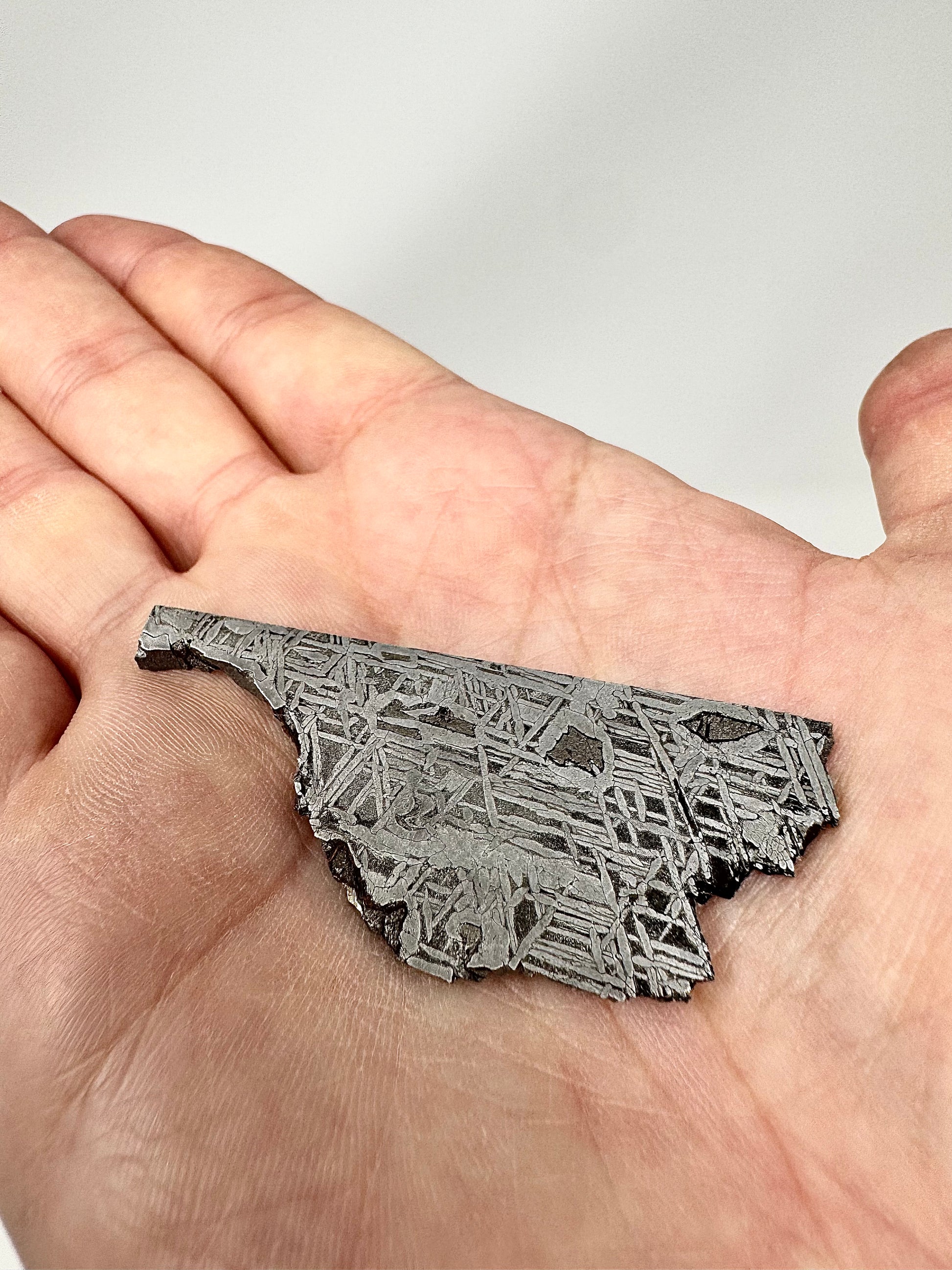 One of the most striking features of iron meteorites is the Widmanstätten pattern—a distinctive interlocking crystalline structure of nickel-iron alloys that can be revealed through careful acid etching. This process requires expert preparation, including stabilization, slicing, and polishing, as even slight errors can damage the specimen. The pattern itself is often called the meteorite’s “thumbprint” because it is entirely unique and cannot be replicated in laboratory conditions. Its formation requires incredibly slow cooling—about one degree Celsius every 10,000 years—making it a visual testament to the vast timescales and processes that shaped our solar system.