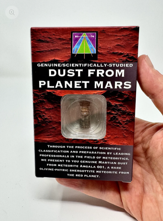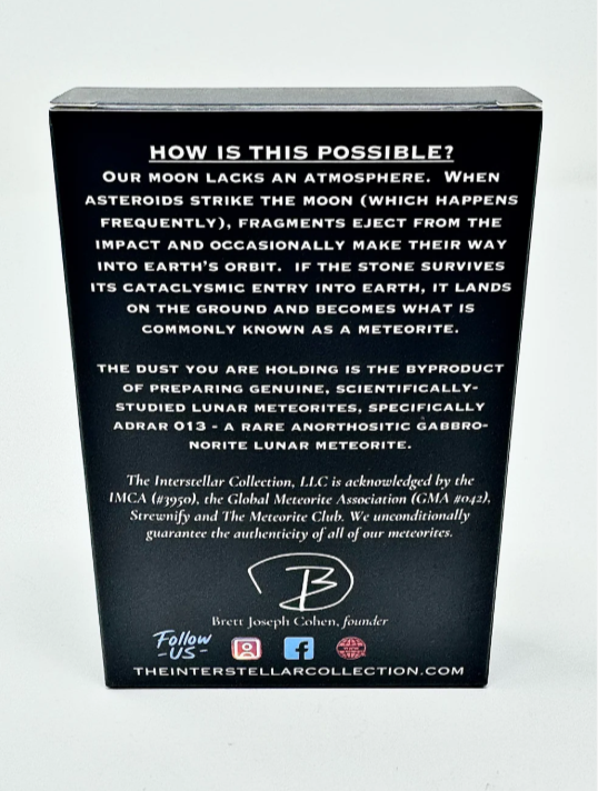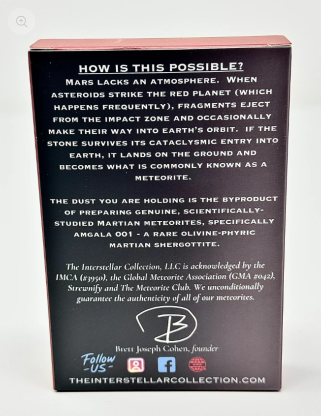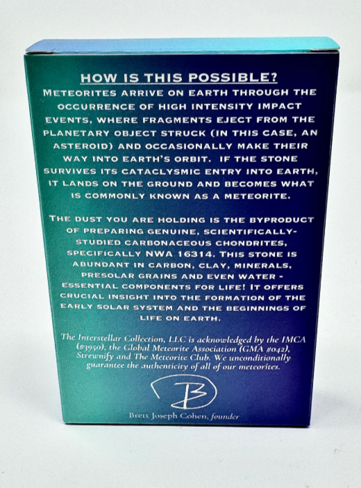 You'll receive 3 beautiful boxes containing 3 different, authentic and scientifically-studied meteorite dust vials inside - one filled with genuine Martian meteorite dust from Mars, another filled with genuine Lunar meteorite dust from the Moon and finally, genuine Carbonaceous Chondrite meteorite dust - dust from a carbon-rich asteroid - just like Asteroid Bennu! These types of Asteroids contain organic molecules and could have even been responsible for the materialization of life on Earth!