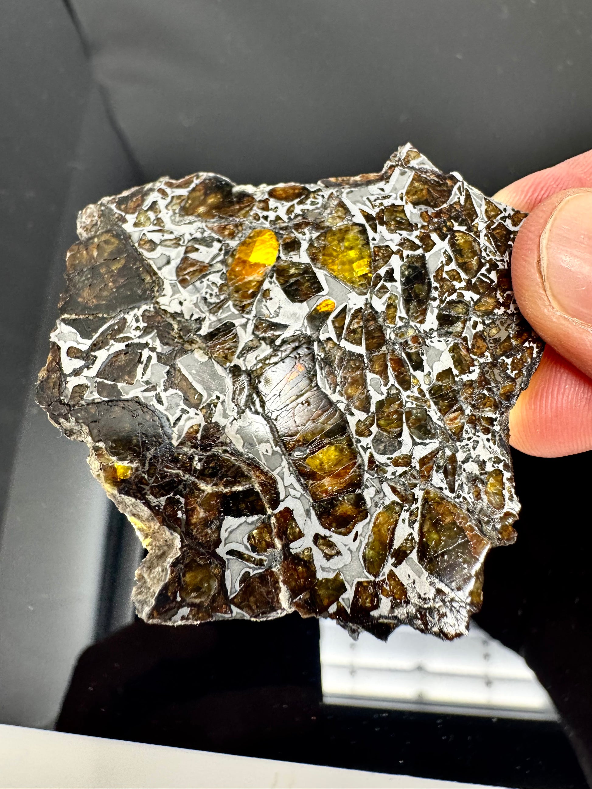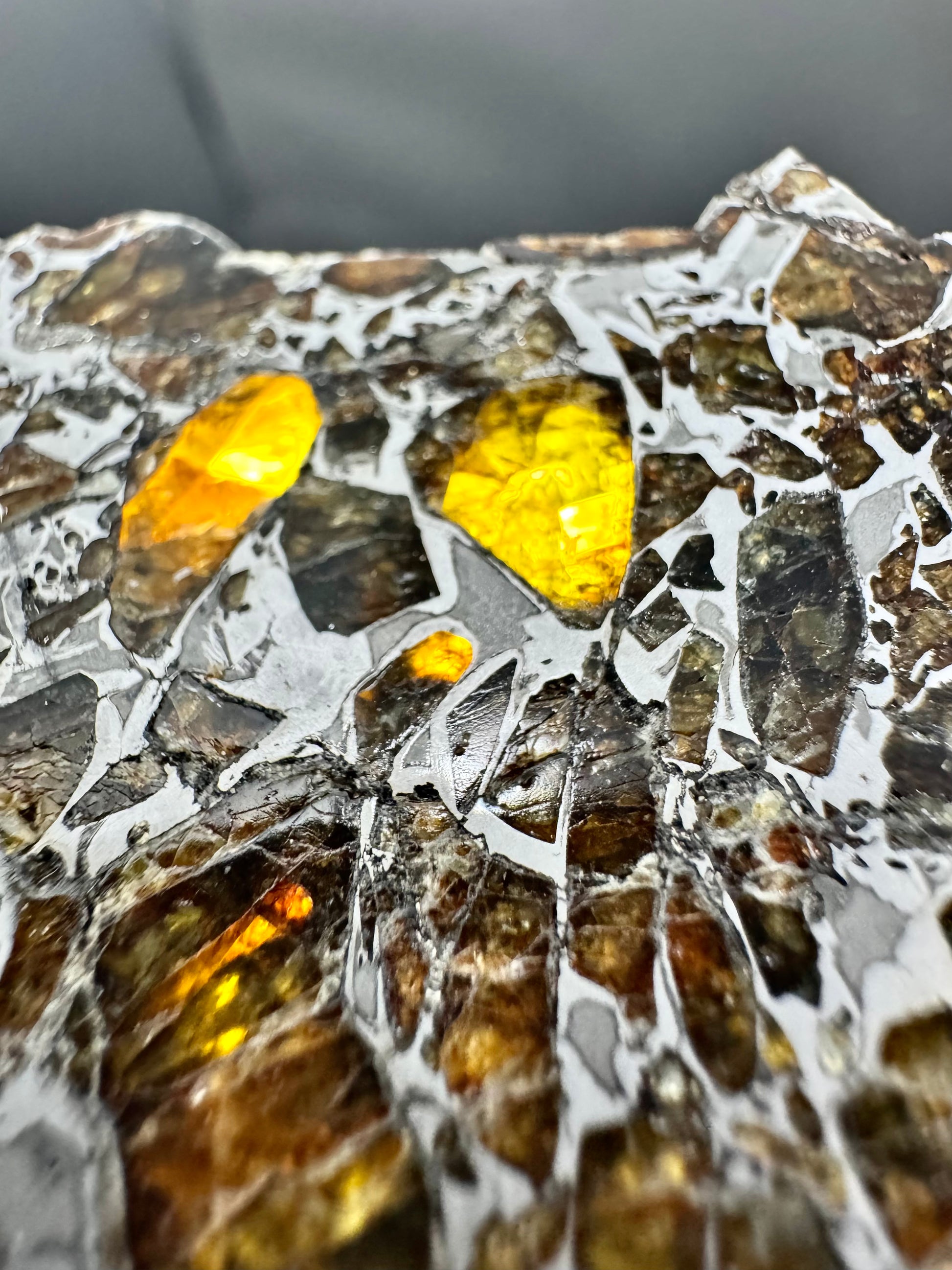 The Admire pallasite is composed of approximately equal proportions of nickel-iron and olivine (forsterite) crystals. When sectioned, these olivine inclusions reveal a striking translucency under transmitted light, making Admire specimens especially sought after for both scientific study and aesthetic display.