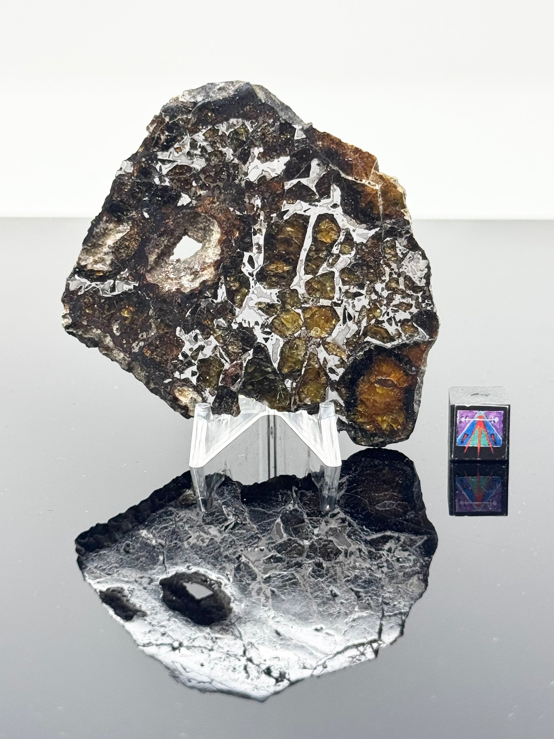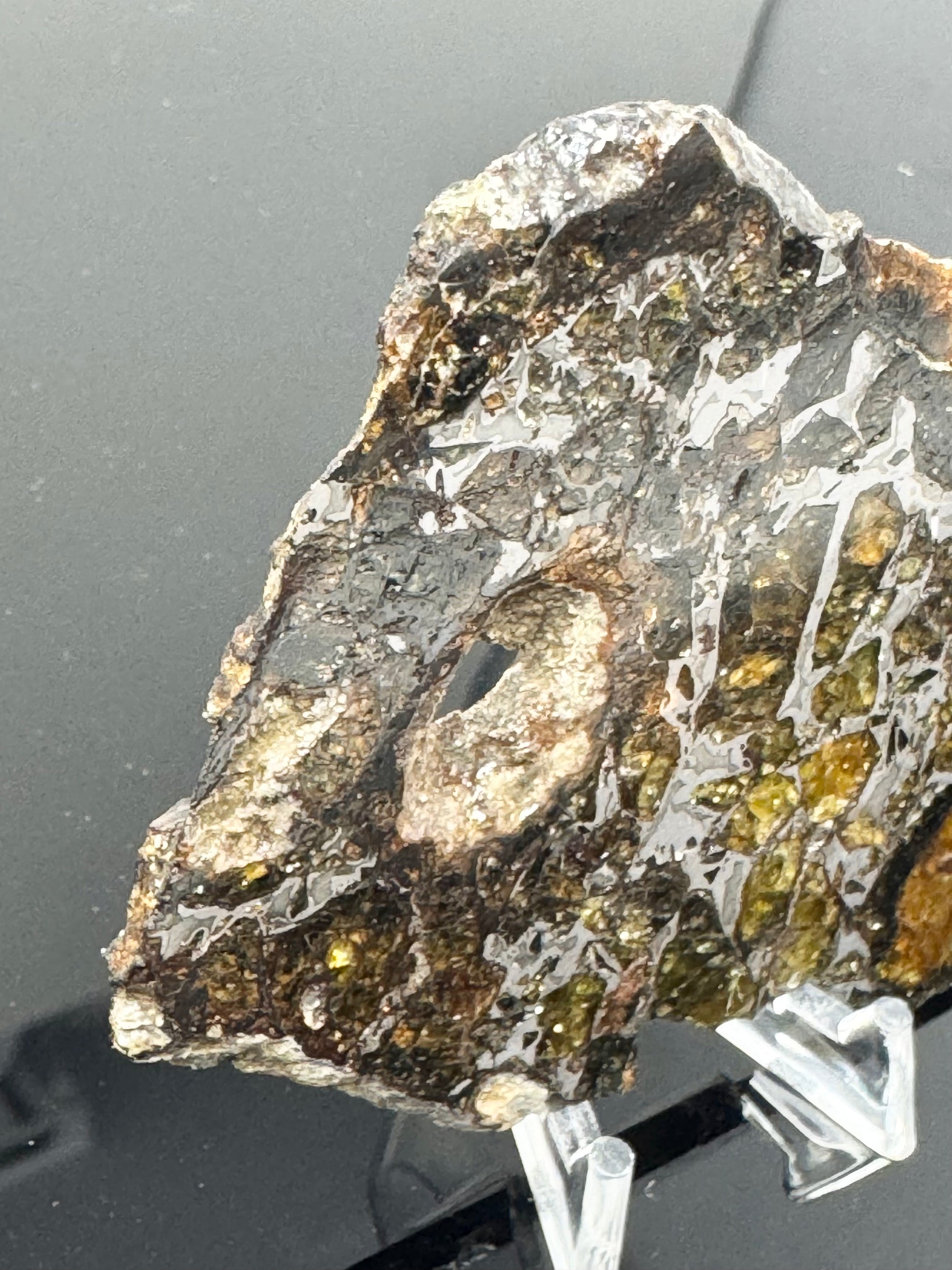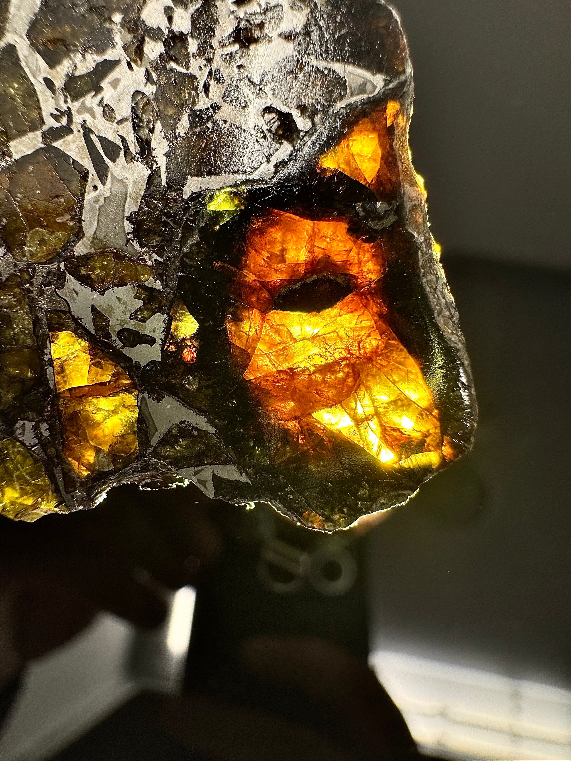 The Admire pallasite is composed of approximately equal proportions of nickel-iron and olivine (forsterite) crystals. When sectioned, these olivine inclusions reveal a striking translucency under transmitted light, making Admire specimens especially sought after for both scientific study and aesthetic display.