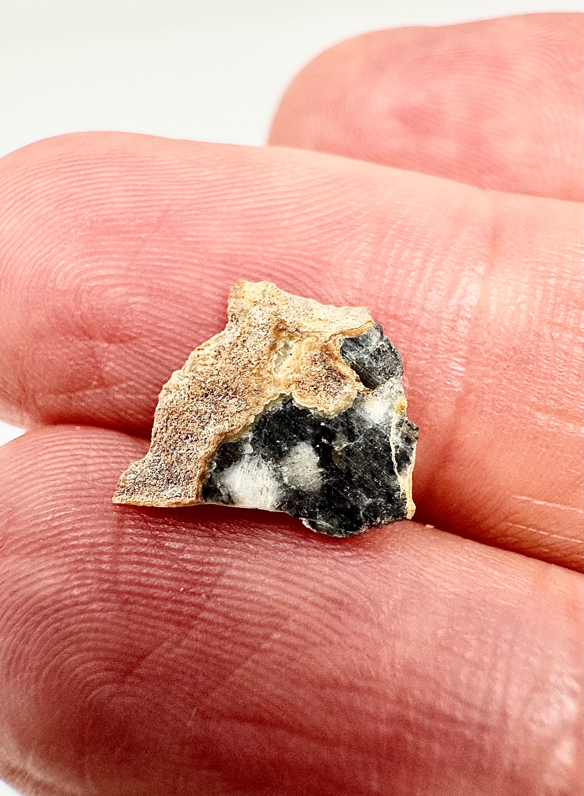 This stunning lunar feldspathic breccia meteorite was discovered in Northwest Africa on March 24, 2022 by a meteorite hunting team. It exhibits light brown weathered exteriors, medium gray fresh interiors with white clasts and rare, tiny metal grains.