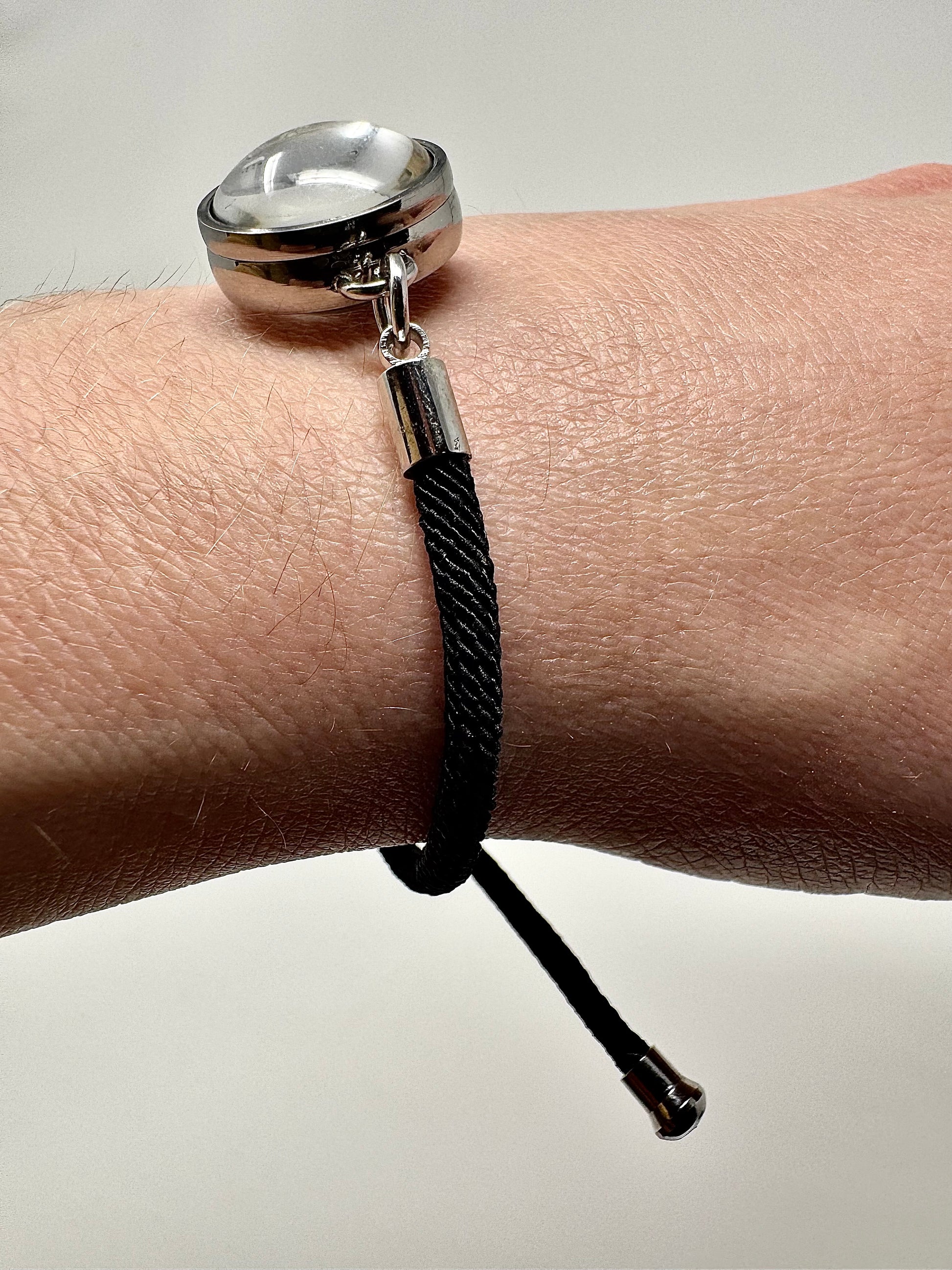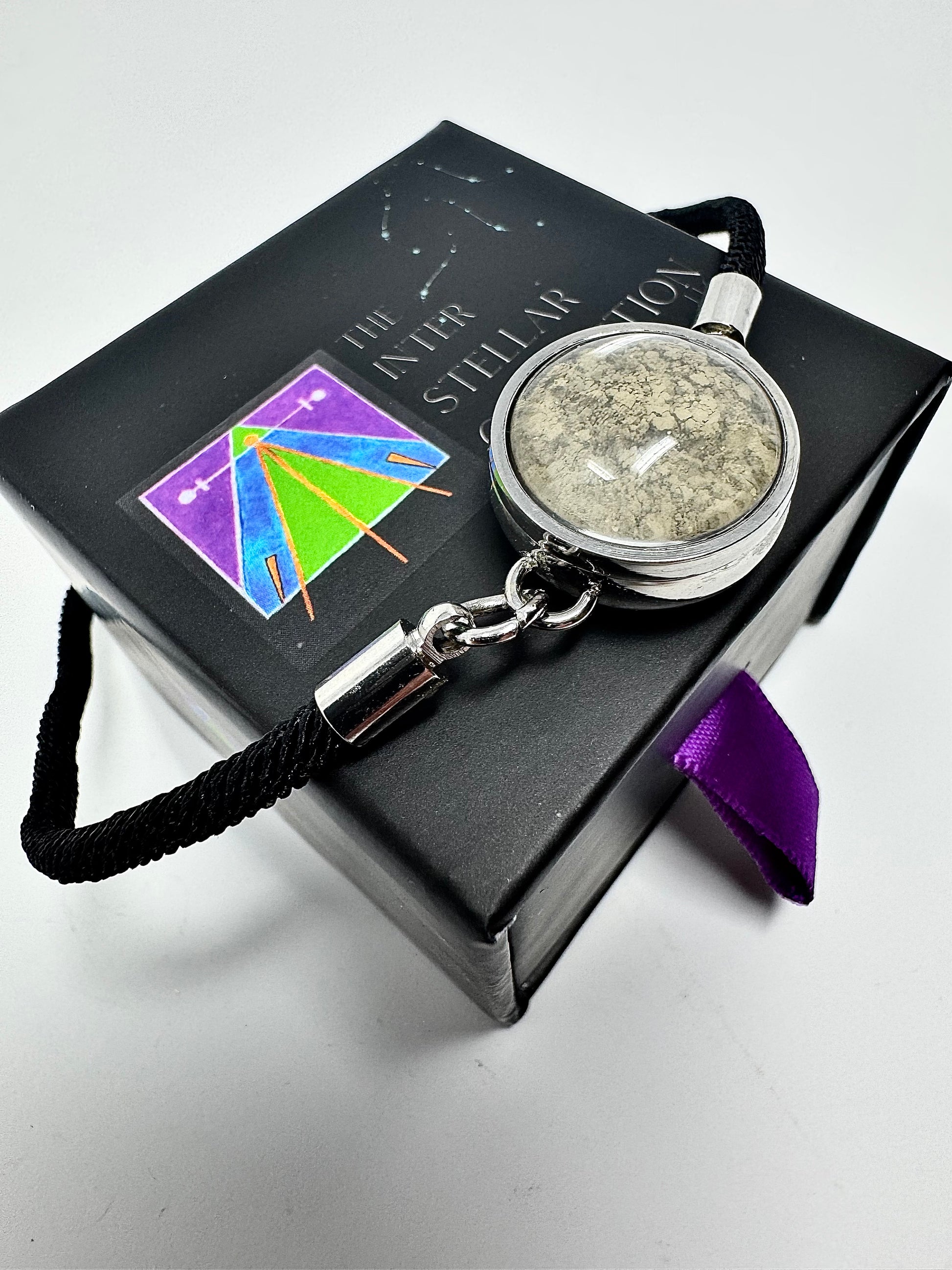 Our 100% genuine Lunar dust bracelets are made with a beautiful black corded rope and strong stainless steel surrounded by a 360 degree glass viewing window. The corded rope is adjustable for your convenience. These unique talking pieces are designed to be worn and shown off and make very unique gift ideas! Each bracelet comes in a beautiful jewelry box, along with a certificate of authenticity card and description of the meteorite dust.