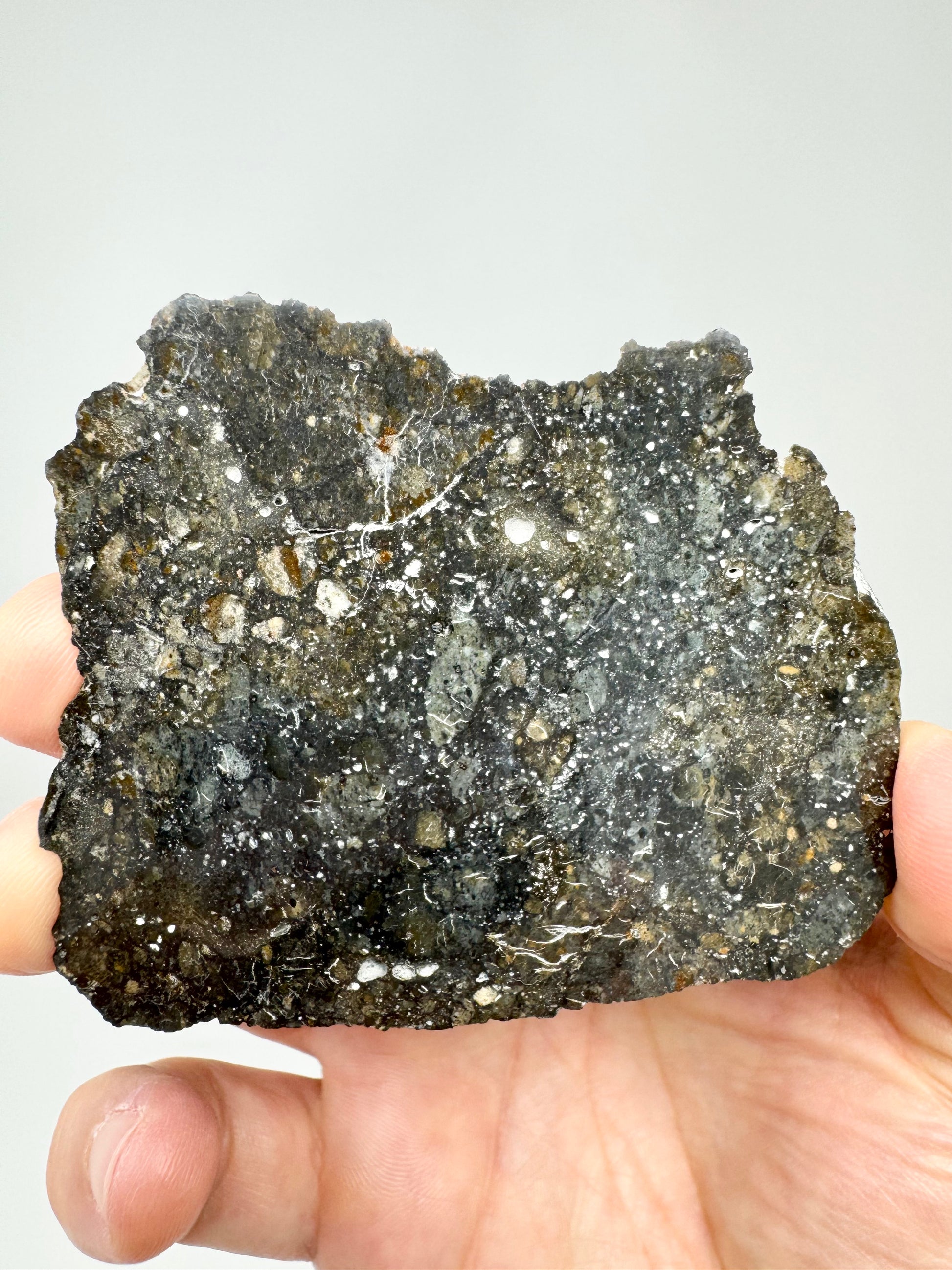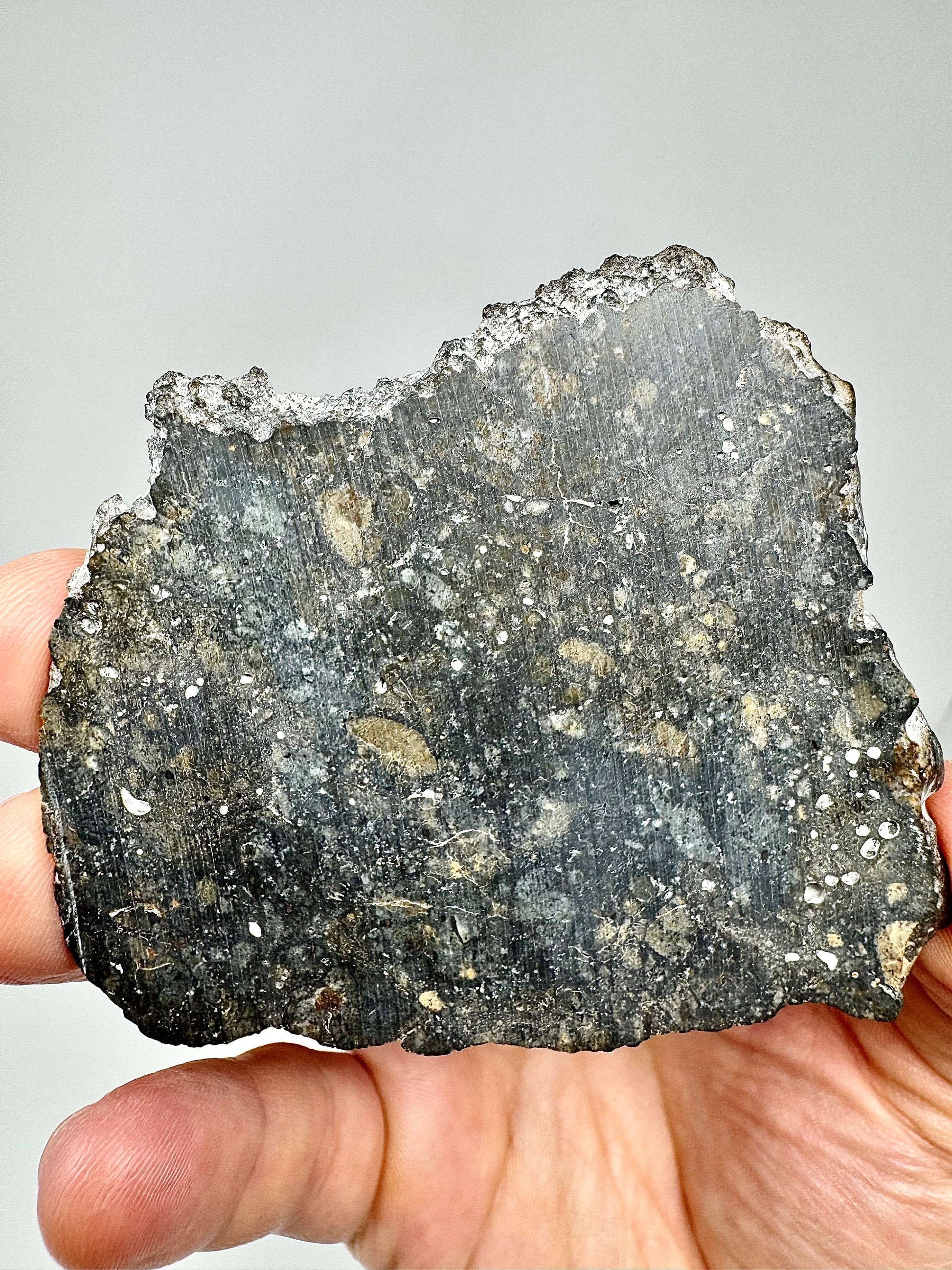 What sets this lunar apart is its fascinating mineral makeup, a complex mix that offers a glimpse into the Moon’s ancient and mysterious past. In the right lighting, some of these specific lunar meteorites reveal a faint bluish hue at certain angles—a rare and beautiful feature we’ve not encountered before in other lunars. Its expertly polished surface highlights the stone’s natural texture, coloration, and embedded clasts, making it a standout display piece for any collector.