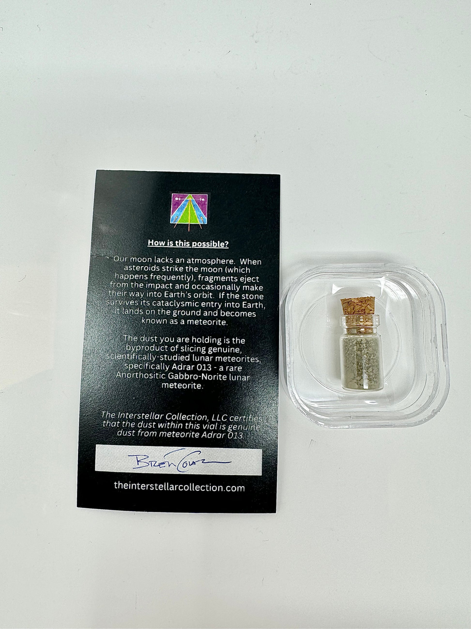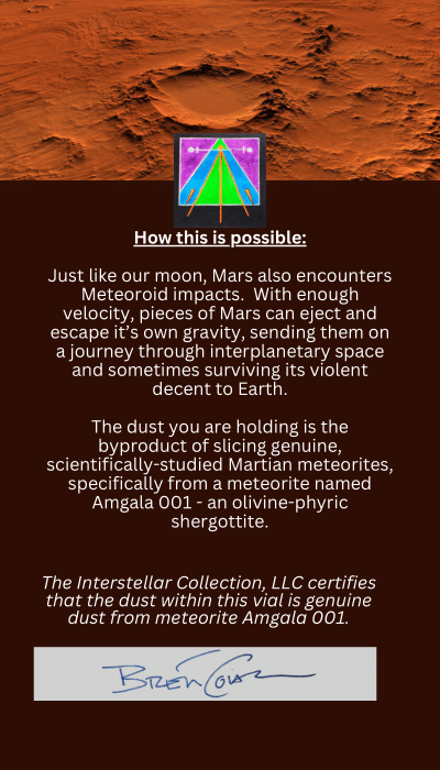You are purchasing a set of 2 beautiful vials filled with certified genuine Lunar and Martian meteorite dust, each encased in a membrane display case. That's two vials in total! The meteorites that the dust derived from have been scientifically studied and confirmed to be of Martian and Lunar origin by leading scientists in the field of Meteoritics.
