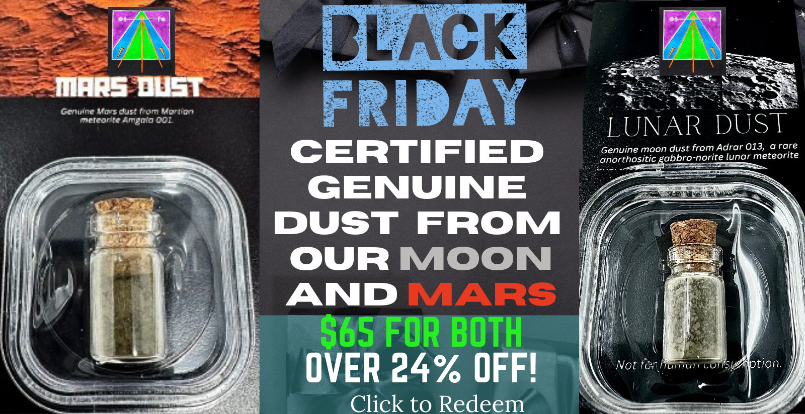 Your Early Black Friday Special Has Arrived! Enjoy the most perfect set of our most popular items we sell: A Certified Genuine Lunar Dust Vial and a Certified Genuine Martian Dust Vial! The total value of the set is $85.98, but you'll be receiving them for only $65 during this very limited time offer. You're saving over 24%.