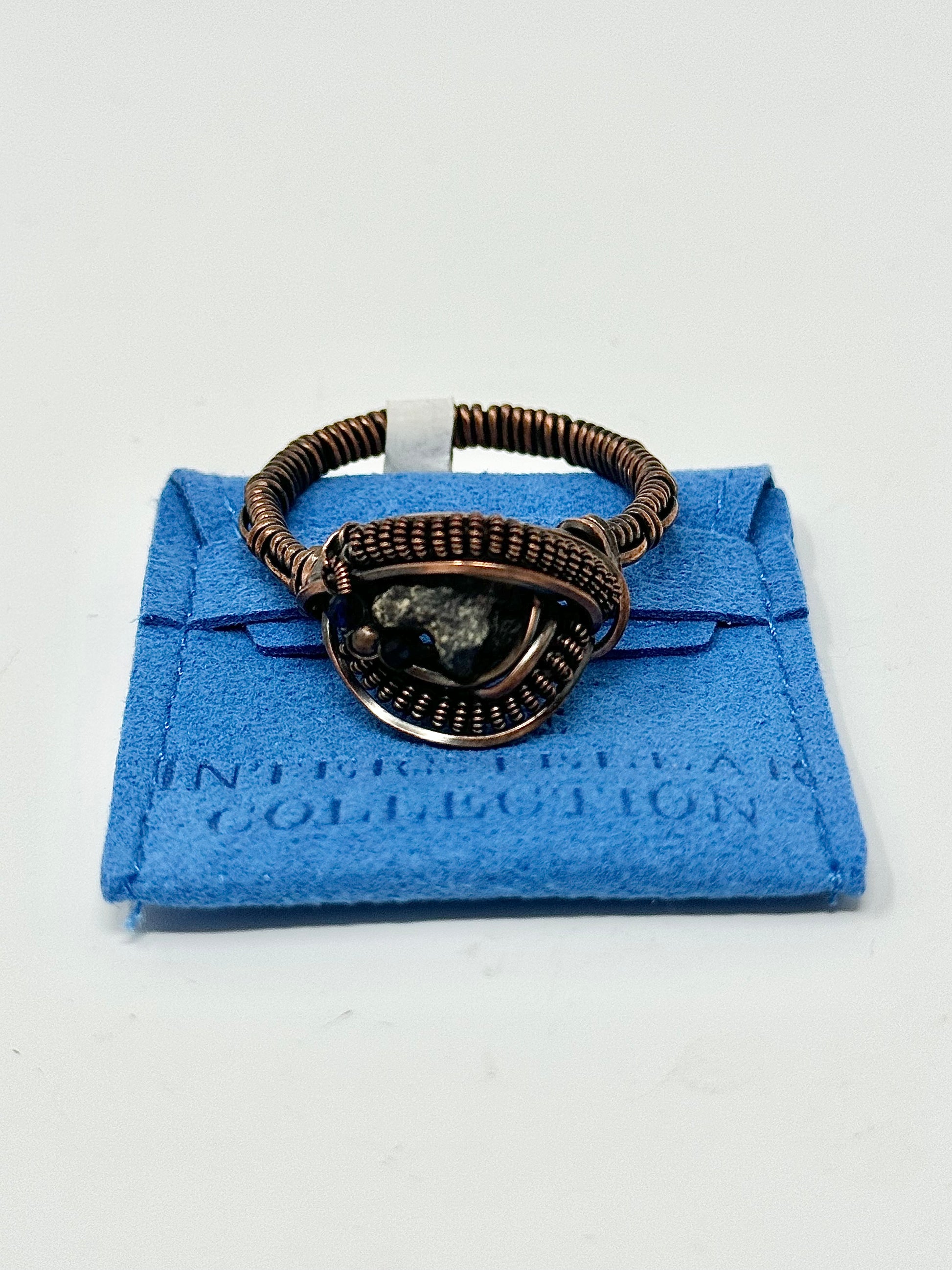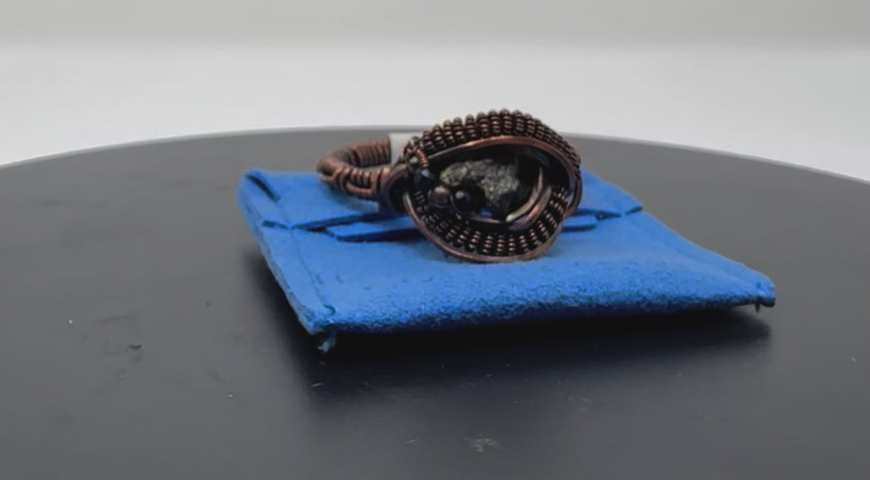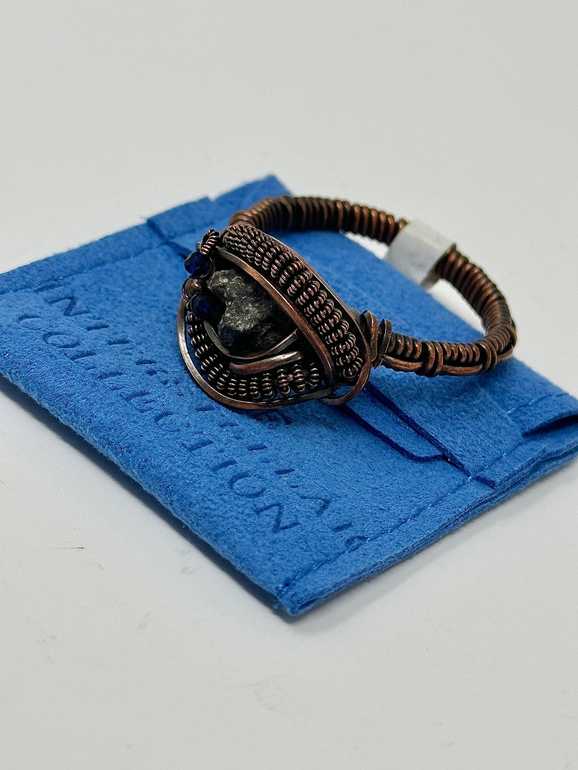 Experience the wonders of the universe in the most intimate way possible with this stunning copper ring with a genuine lunar meteorite and sapphire embedded in the center.