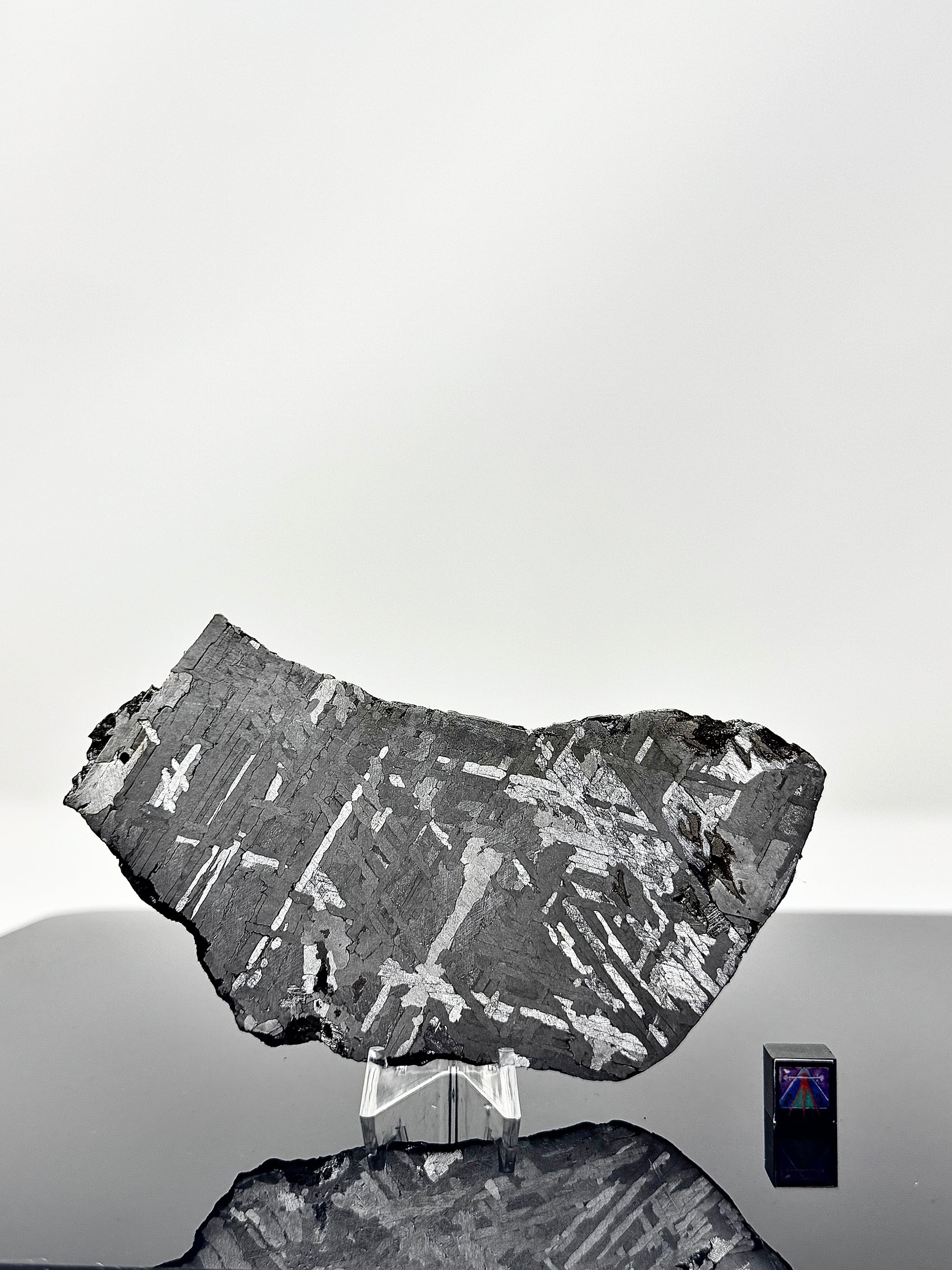 When cut, polished, and etched with acid, the Toluca meteorite reveals a striking Widmanstätten pattern—a distinctive interlocking structure of kamacite and taenite crystals that formed as the molten metal cooled slowly over millions of years inside its parent asteroid. This crystalline pattern is unique to meteorites and cannot be replicated in terrestrial iron, serving as a visible record of the meteorite’s cosmic origin and incredibly slow cooling history. Each slice displays its own variation of this geometric pattern, making every piece a one-of-a-kind natural artwork from outer space.