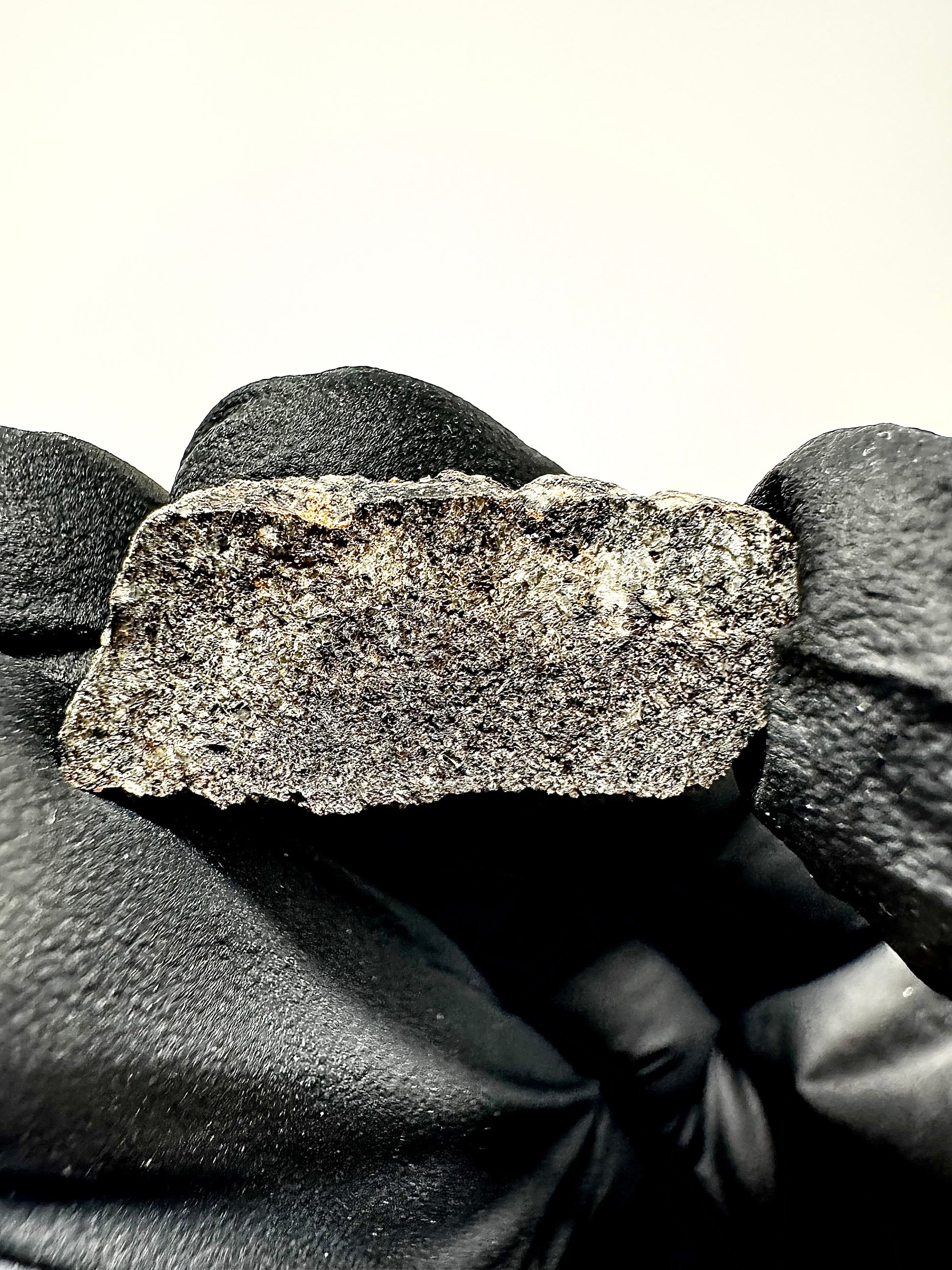 You are viewing meteorite Ksar Ghilane 022 which was found in Tatawin, Tunisia in 2023, and is classified as an ungrouped achondrite, magnesium-rich clinopyroxenite with sulphite spheres!