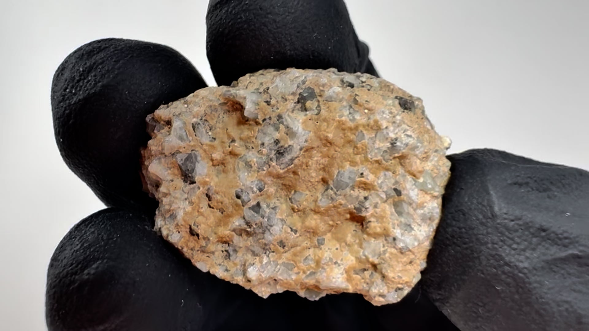 You are viewing meteorite Ksar Ghilane 022 which was found in Tatawin, Tunisia in 2023, and is classified as an ungrouped achondrite, magnesium-rich clinopyroxenite with sulphite spheres!