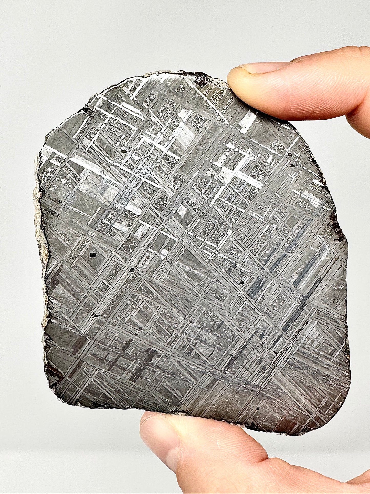 One of the most striking features of iron meteorites is the Widmanstätten pattern—a distinctive interlocking crystalline structure of nickel-iron alloys that can be revealed through careful acid etching. This process requires expert preparation, including stabilization, slicing, and polishing, as even slight errors can damage the specimen. The pattern itself is often called the meteorite’s “thumbprint” because it is entirely unique and cannot be replicated in laboratory conditions. Its formation requires incredibly slow cooling—about one degree Celsius every 10,000 years—making it a visual testament to the vast timescales and processes that shaped our solar system.