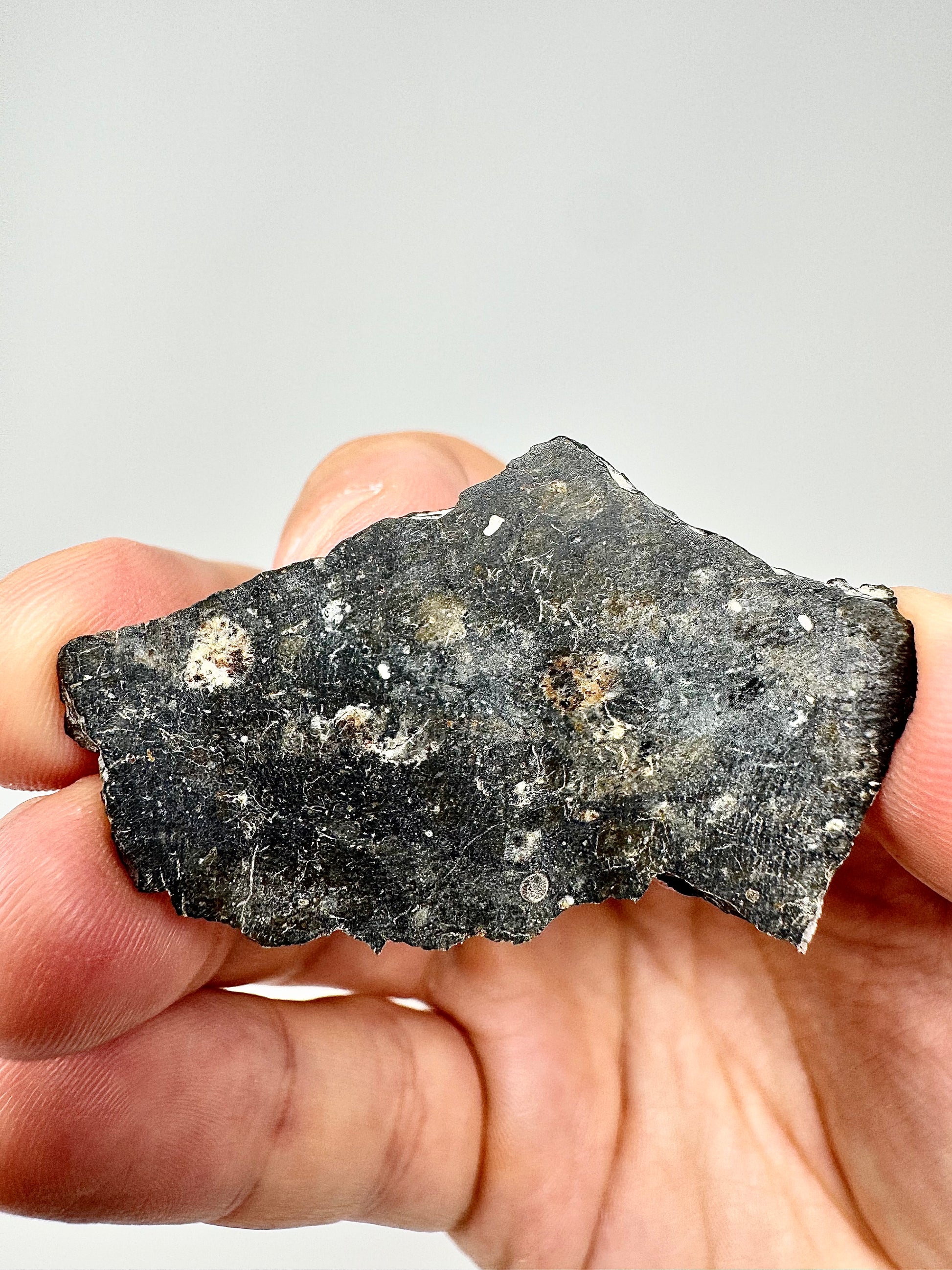 What sets this lunar apart is its fascinating mineral makeup, a complex mix that offers a glimpse into the Moon’s ancient and mysterious past. In the right lighting, some of these specific lunar meteorites reveal a faint bluish hue at certain angles—a rare and beautiful feature we’ve not encountered before in other lunars. Its expertly polished surface highlights the stone’s natural texture, coloration, and embedded clasts, making it a standout display piece for any collector.