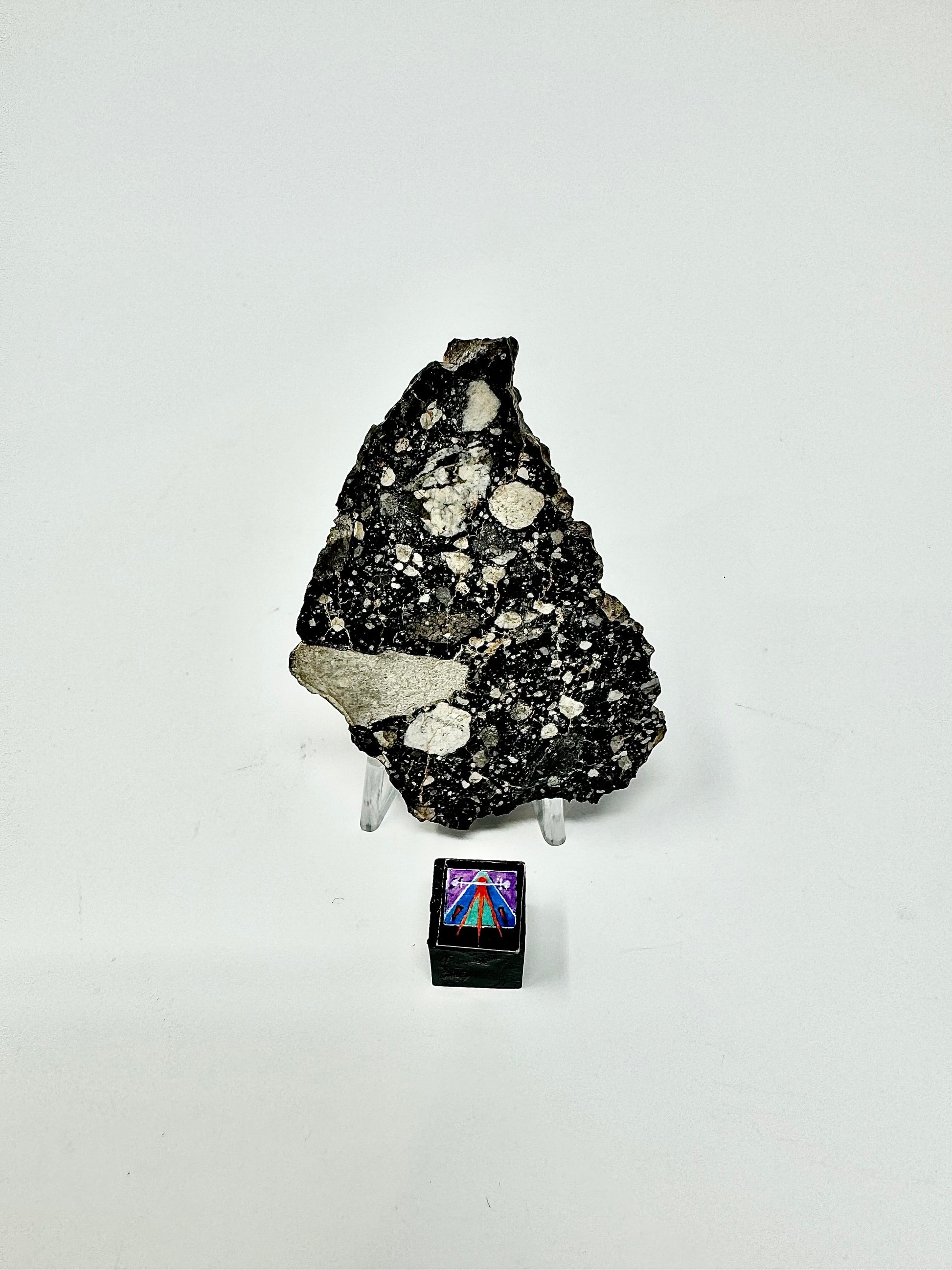 We welcome you to view one of our prettiest lunar meteorites in existence, NWA 14685, a rare and captivating lunar meteorite specimen that embodies the very essence of our moon. This stunning end cut provides a distinct opportunity to possess a fragment of space history. NWA 14685 Lunar Meteorite belongs to an esteemed category of meteorites that have ejected from the moon's surface due to ancient cosmic collisions, voyaging through space to grace our planet with its extraordinary presence.