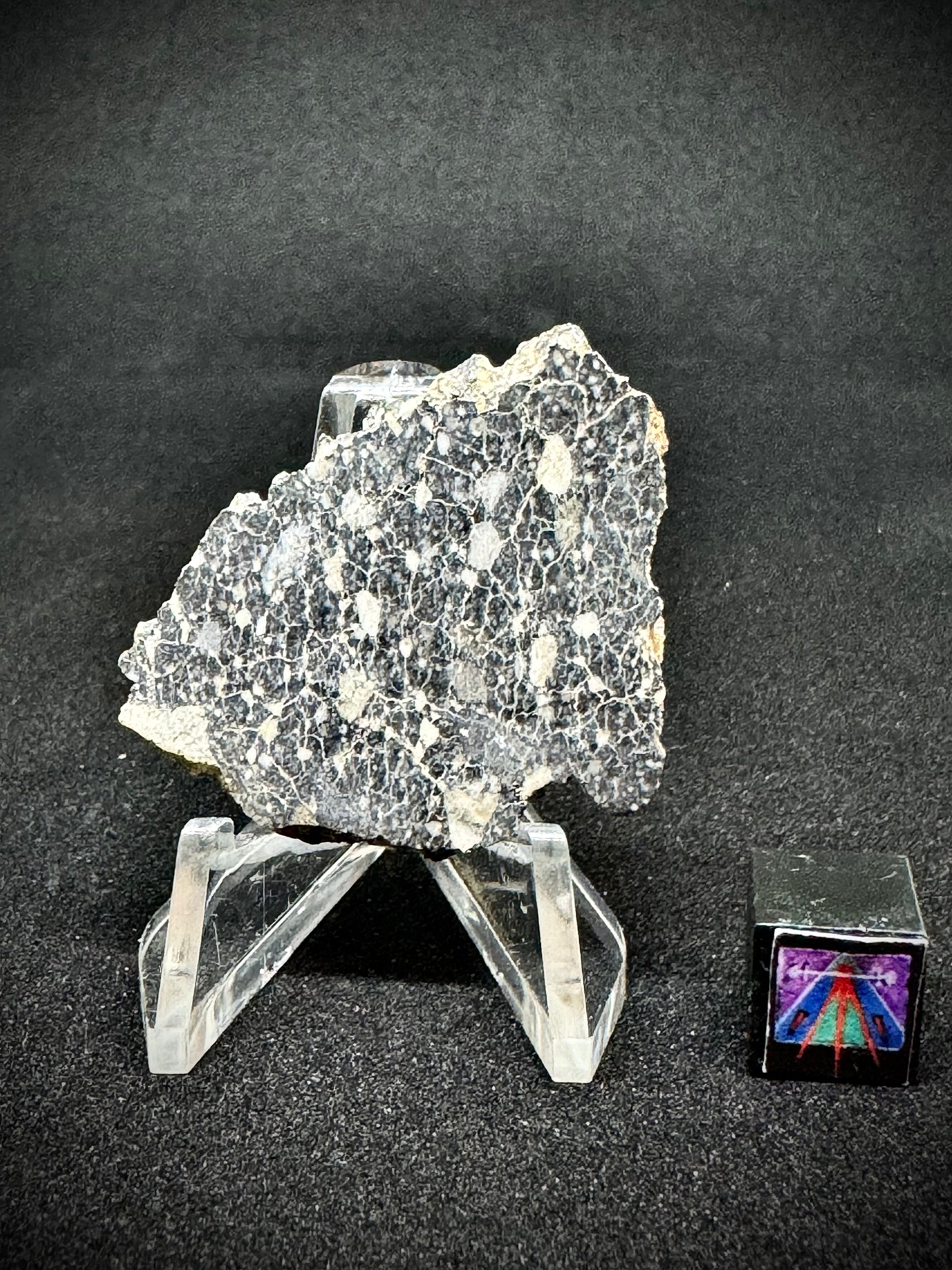 We welcome you to view one of our prettiest lunar meteorites in existence, NWA 14685, a rare and captivating lunar meteorite specimen that embodies the very essence of our moon. This stunning full slice provides a distinct opportunity to possess a fragment of space history. NWA 14685 Lunar Meteorite belongs to an esteemed category of meteorites that have ejected from the moon's surface due to ancient cosmic collisions, voyaging through space to grace our planet with its extraordinary presence.