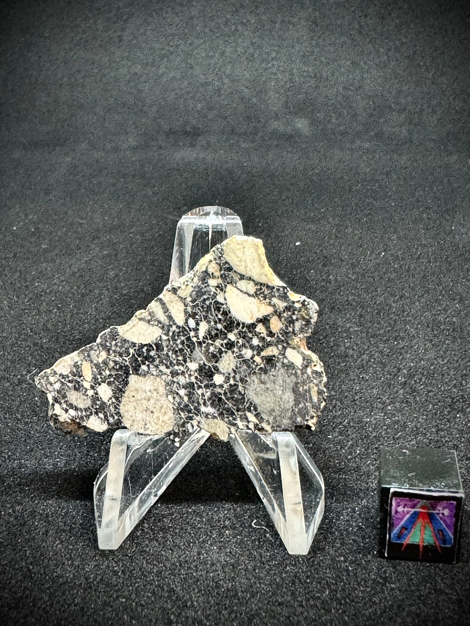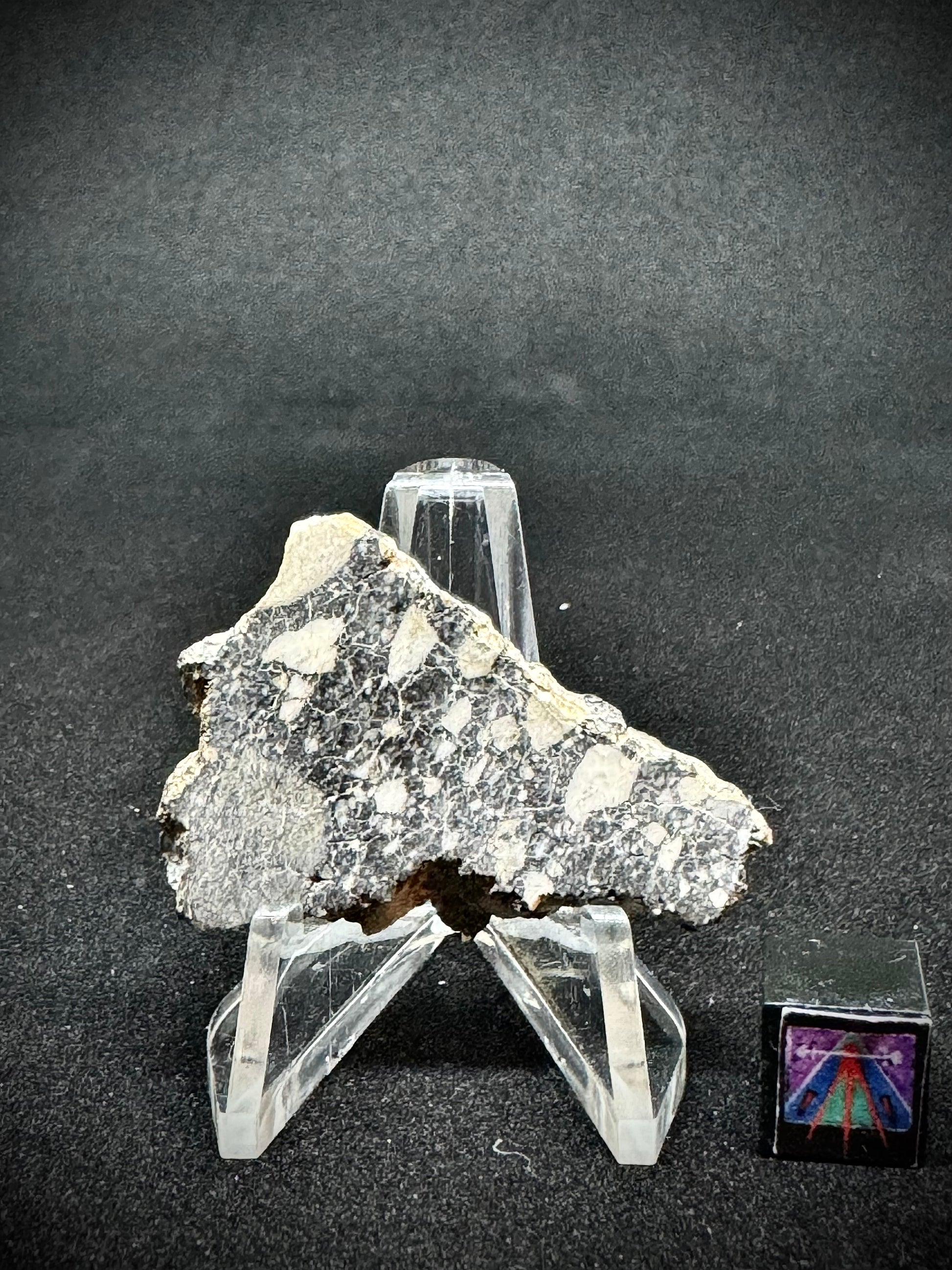 We welcome you to view one of our prettiest lunar meteorites in existence, NWA 14685, a rare and captivating lunar meteorite specimen that embodies the very essence of our moon. This stunning full slice provides a distinct opportunity to possess a fragment of space history. NWA 14685 Lunar Meteorite belongs to an esteemed category of meteorites that have ejected from the moon's surface due to ancient cosmic collisions, voyaging through space to grace our planet with its extraordinary presence.