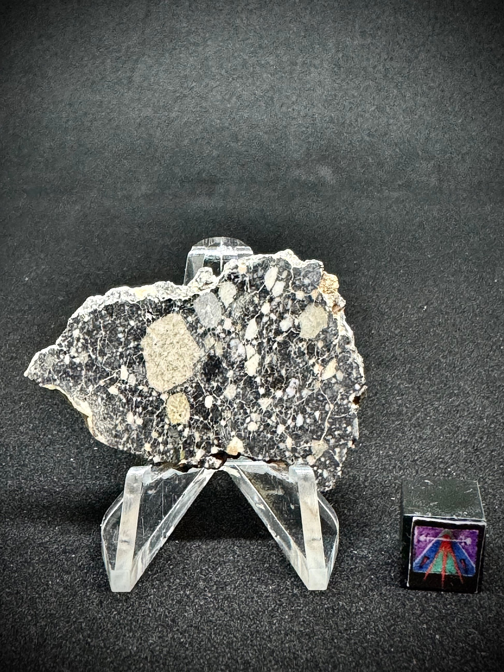We welcome you to view one of our prettiest lunar meteorites in existence, NWA 14685, a rare and captivating lunar meteorite specimen that embodies the very essence of our moon. This stunning full slice provides a distinct opportunity to possess a fragment of space history. NWA 14685 Lunar Meteorite belongs to an esteemed category of meteorites that have ejected from the moon's surface due to ancient cosmic collisions, voyaging through space to grace our planet with its extraordinary presence.