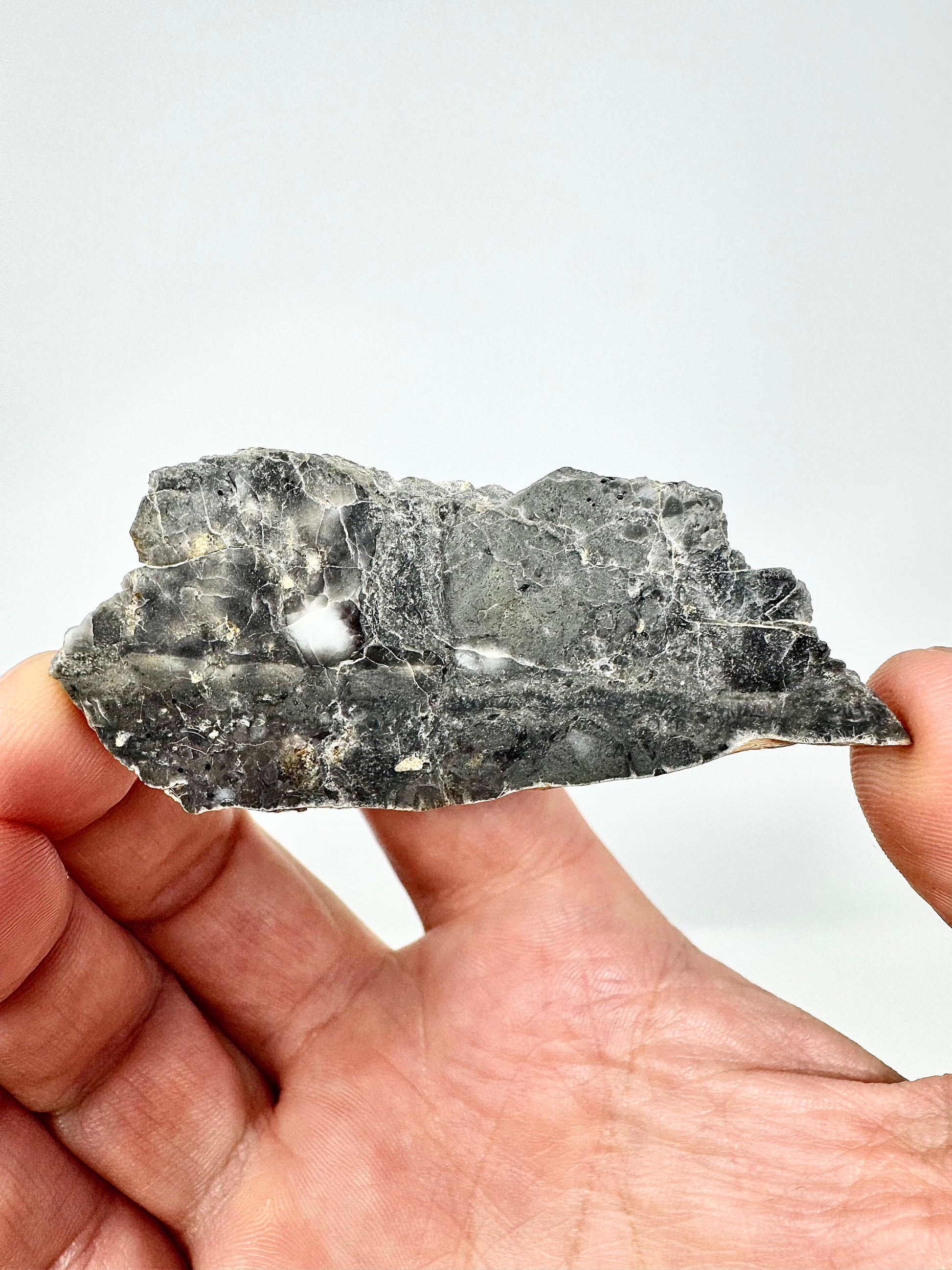You are viewing NWA 16315, a lunar melt breccia meteorite! Some lunar meteorites are described as lunar melt breccias because they formed during powerful impact events on the Moon. When a large asteroid struck the lunar surface, the energy of the impact shattered existing rocks while simultaneously melting part of the target material. Fragments of older lunar rocks were mixed together and cemented by this impact melt, which later cooled and solidified, producing a brecciated rock with angular clasts set in a fine-grained or glassy melt matrix. These rocks preserve clear evidence of shock and melting, recording the violence of the impact that formed them. Subsequent impacts were able to eject pieces of these melt breccias off the Moon, and some of those fragments eventually traveled through space and fell to Earth as lunar meteorites.