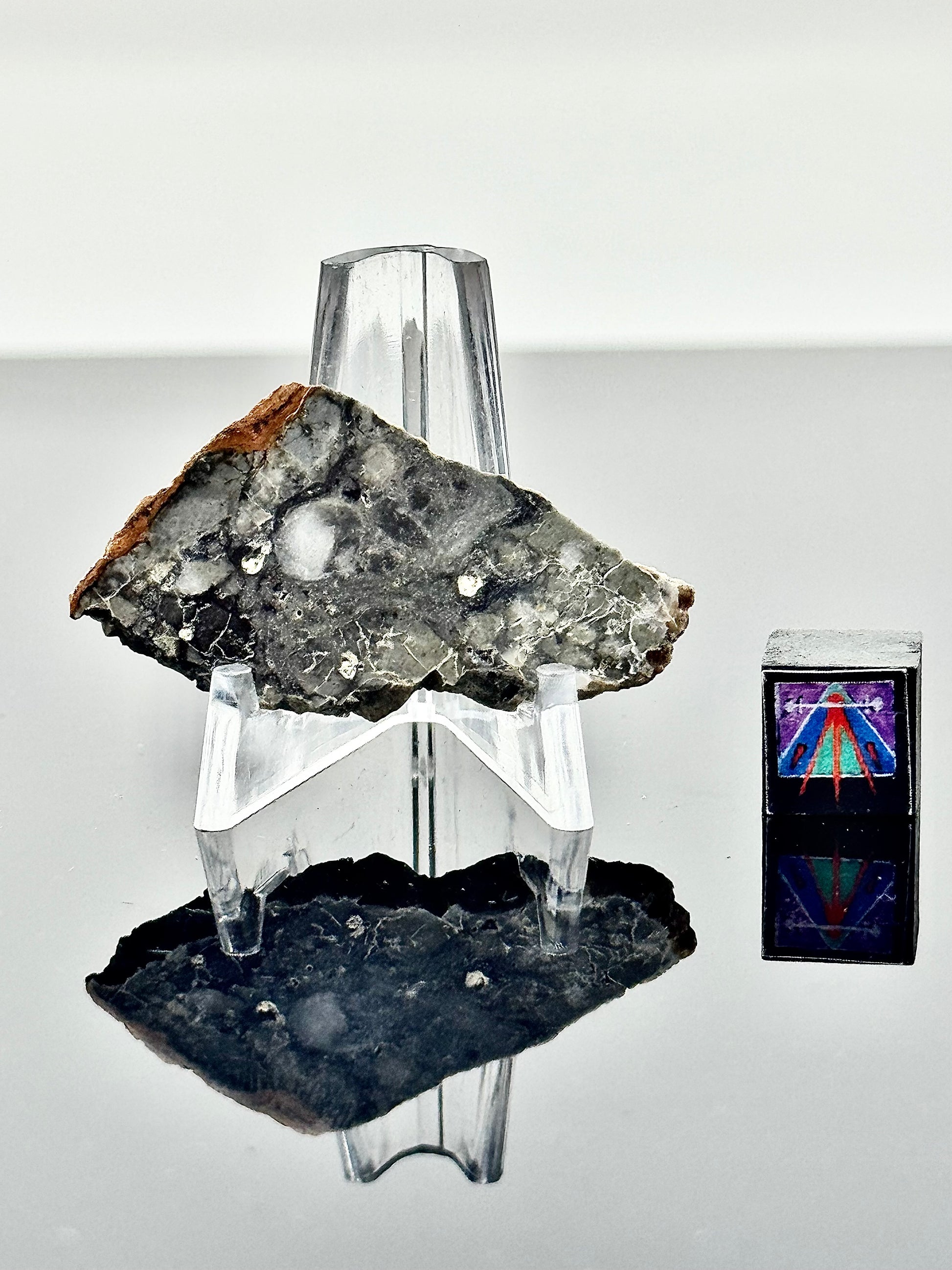 You are viewing NWA 16315, a lunar melt breccia meteorite! Some lunar meteorites are described as lunar melt breccias because they formed during powerful impact events on the Moon. When a large asteroid struck the lunar surface, the energy of the impact shattered existing rocks while simultaneously melting part of the target material. Fragments of older lunar rocks were mixed together and cemented by this impact melt, which later cooled and solidified, producing a brecciated rock with angular clasts set in a fine-grained or glassy melt matrix. These rocks preserve clear evidence of shock and melting, recording the violence of the impact that formed them. Subsequent impacts were able to eject pieces of these melt breccias off the Moon, and some of those fragments eventually traveled through space and fell to Earth as lunar meteorites.