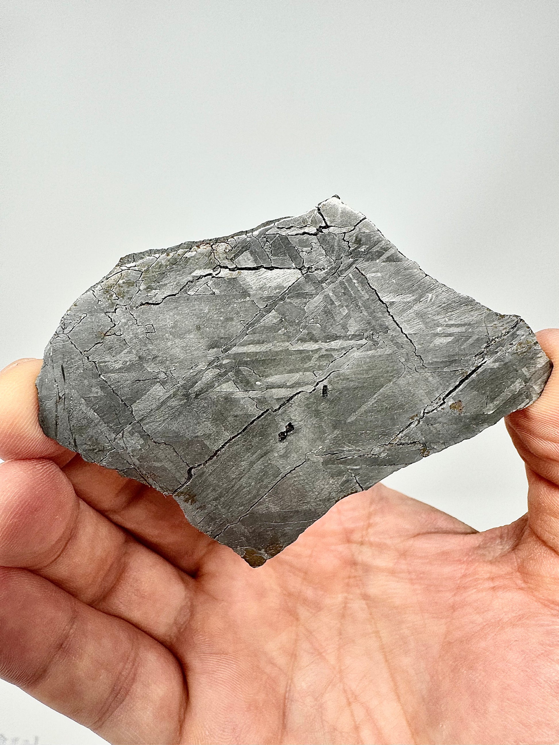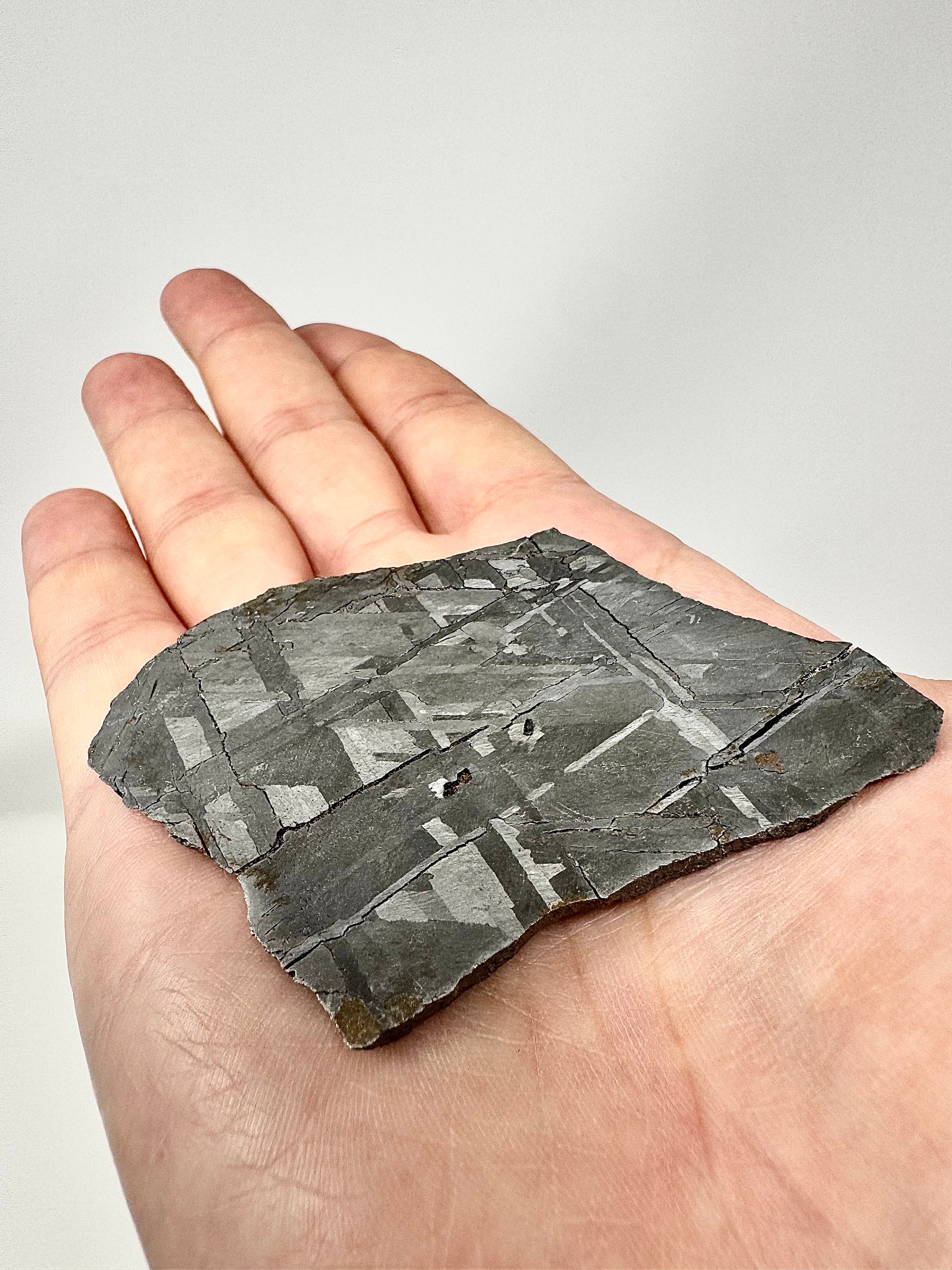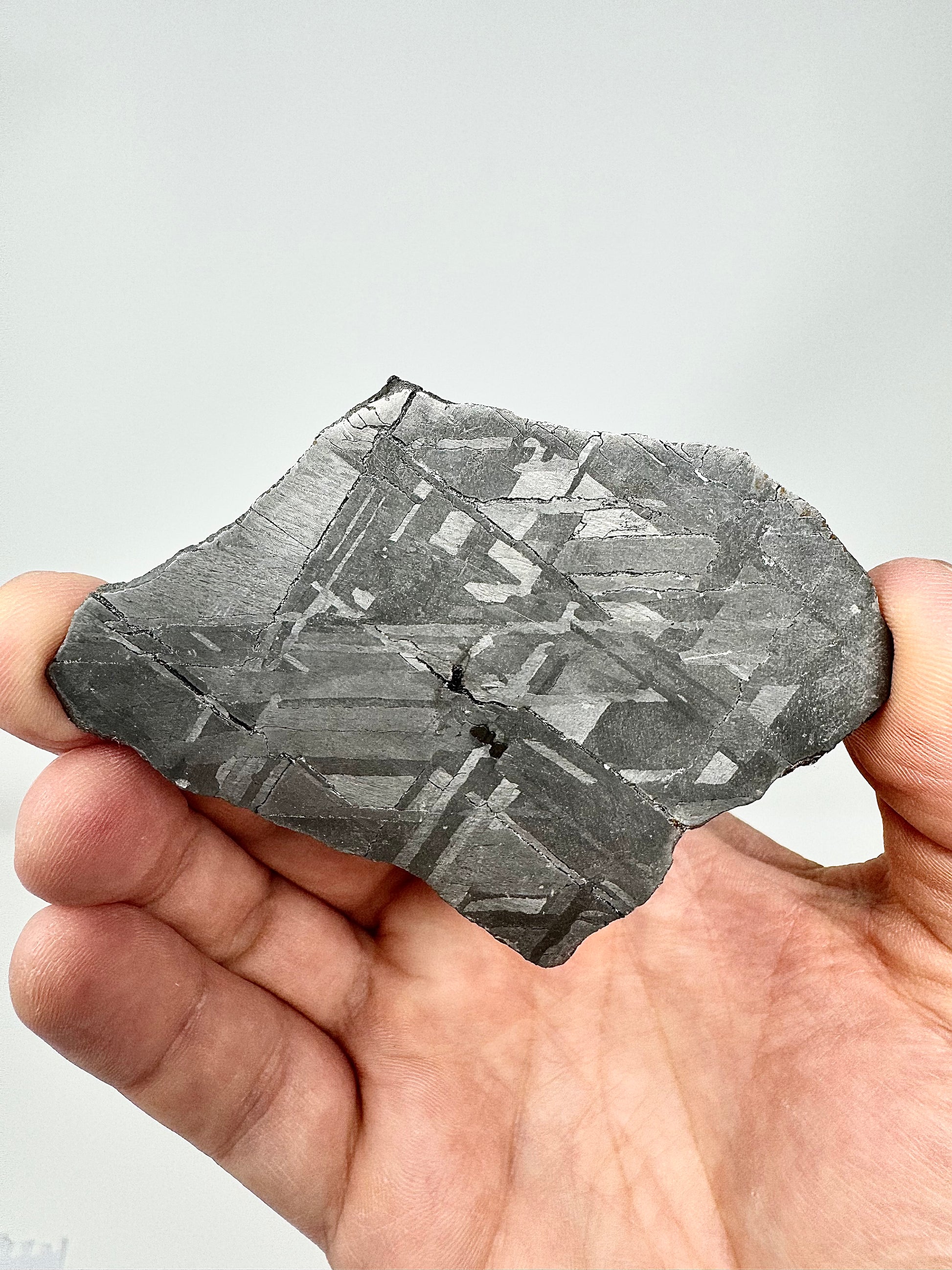 One of the most striking features of iron meteorites is the Widmanstätten pattern—a distinctive interlocking crystalline structure of nickel-iron alloys that can be revealed through careful acid etching. This process requires expert preparation, including stabilization, slicing, and polishing, as even slight errors can damage the specimen. The pattern itself is often called the meteorite’s “thumbprint” because it is entirely unique and cannot be replicated in laboratory conditions. Its formation requires incredibly slow cooling—about one degree Celsius every 10,000 years—making it a visual testament to the vast timescales and processes that shaped our solar system.