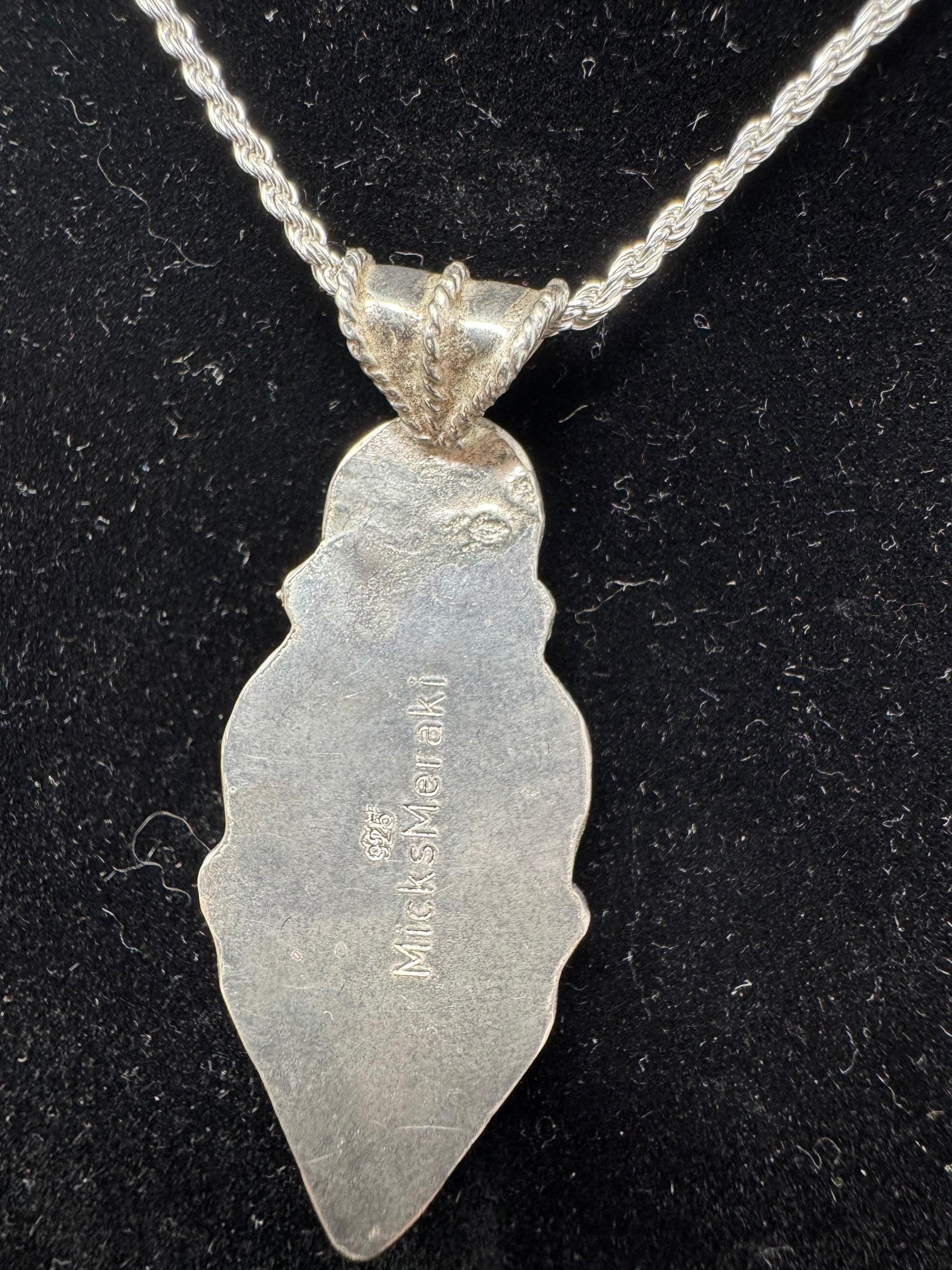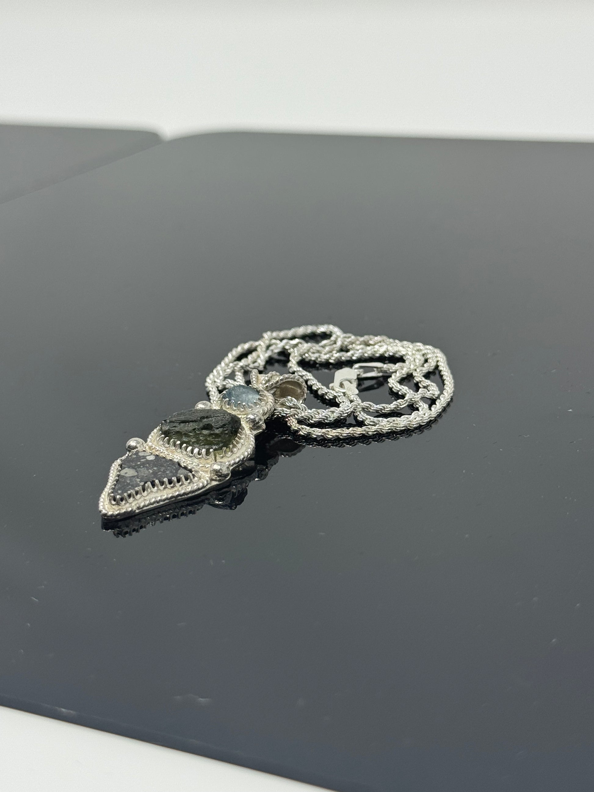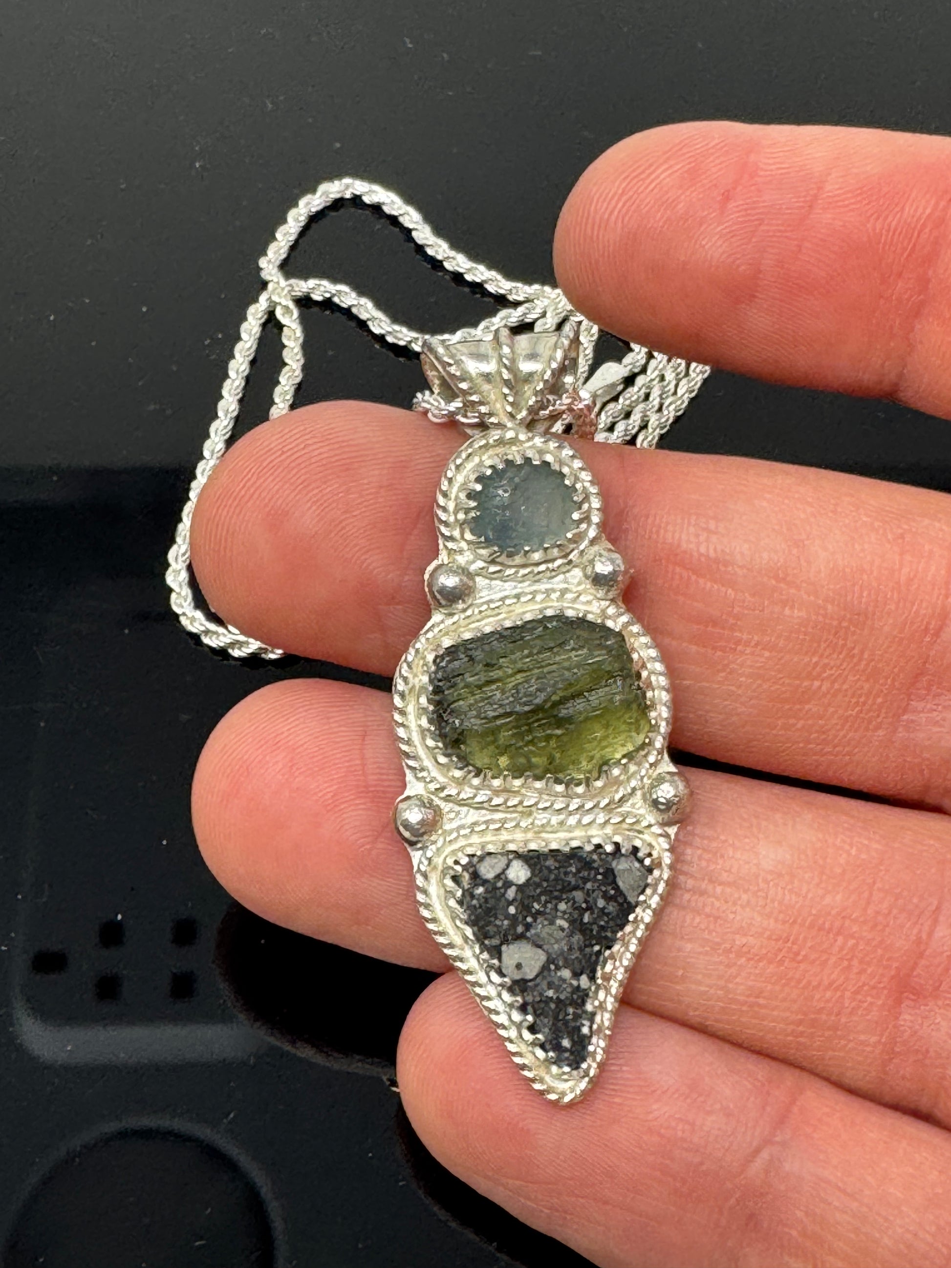 The Surface of the Moon Collection: Stunning Genuine NWA 17679 Lunar Meteorite Silver Necklace w/ Raw Montana Sapphire and Moldavite - Handmade - One of a Kind!